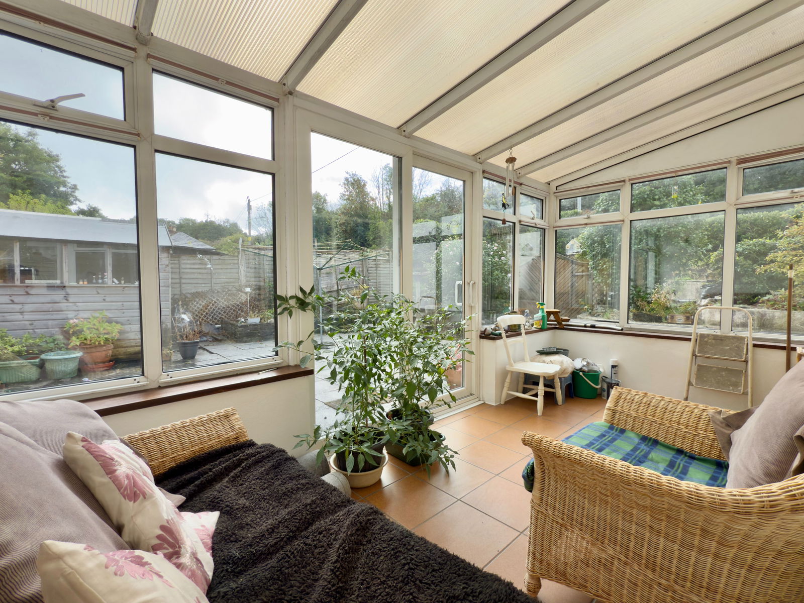Polycarbonate roof, double glazed UPVC windows, tiled floor and double glazed sliding patio doors to garden.