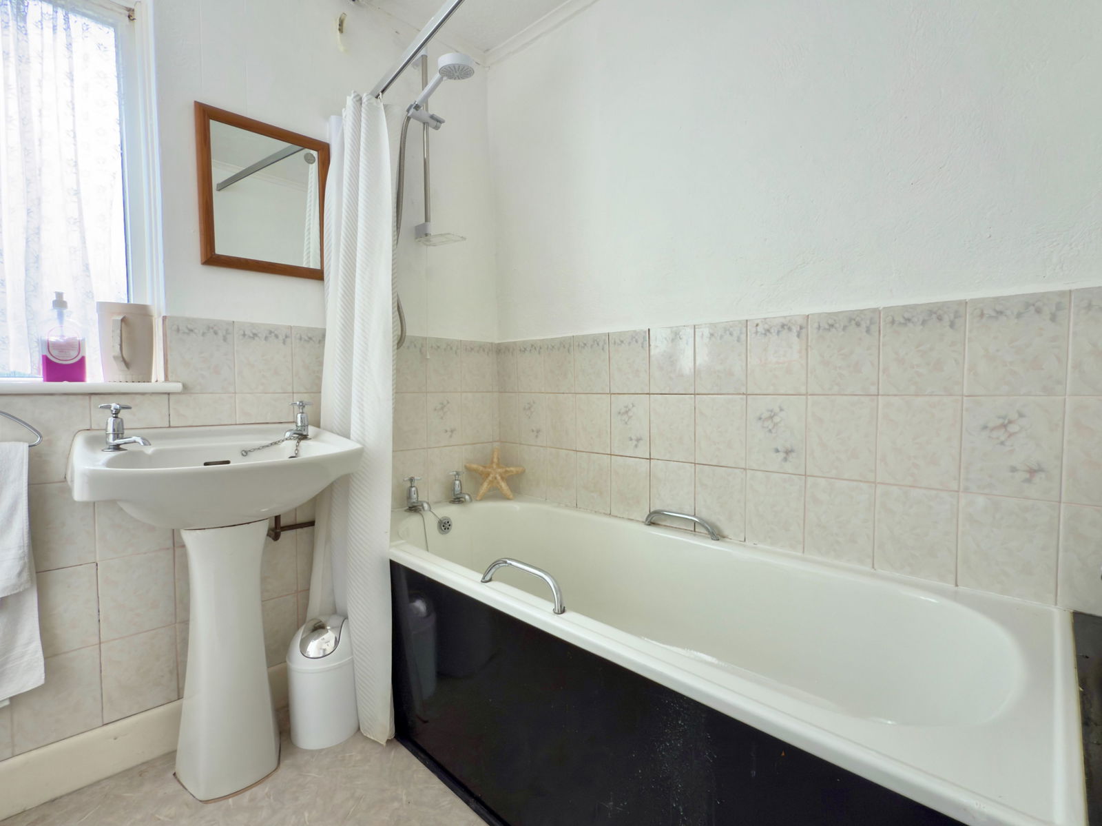 White suite comprising panelled bath with Mira Sport independent electric shower over bath, wash hand basin, low level W.C., part tiled walls, side double glazed window, airing cupboard with copper tank plus header tank and slatted shelving.