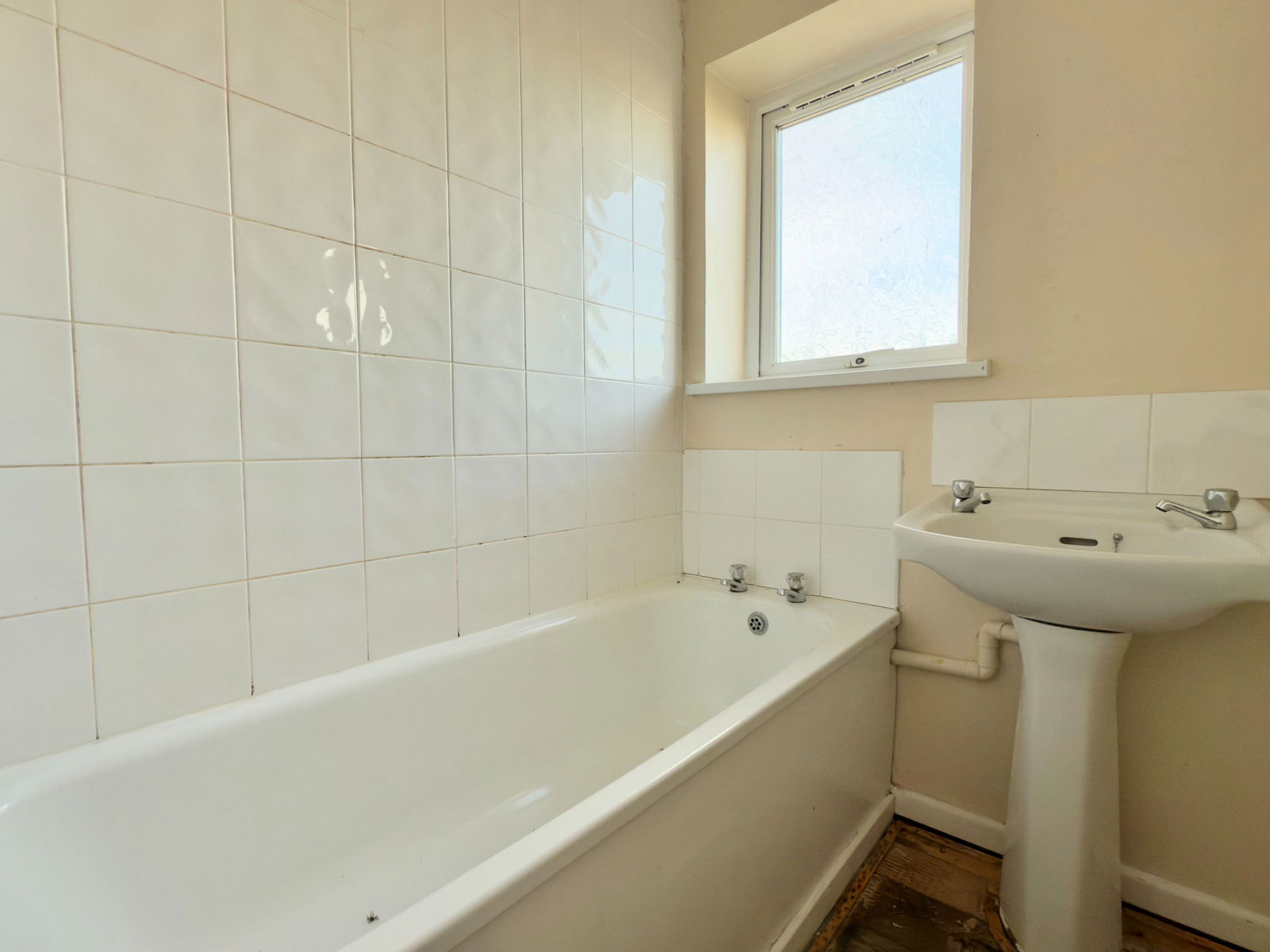 Panelled bath with electric shower over, pedestal wash hand basin and radiator, opaque patterned double glazed window in UPVC frame to rear.