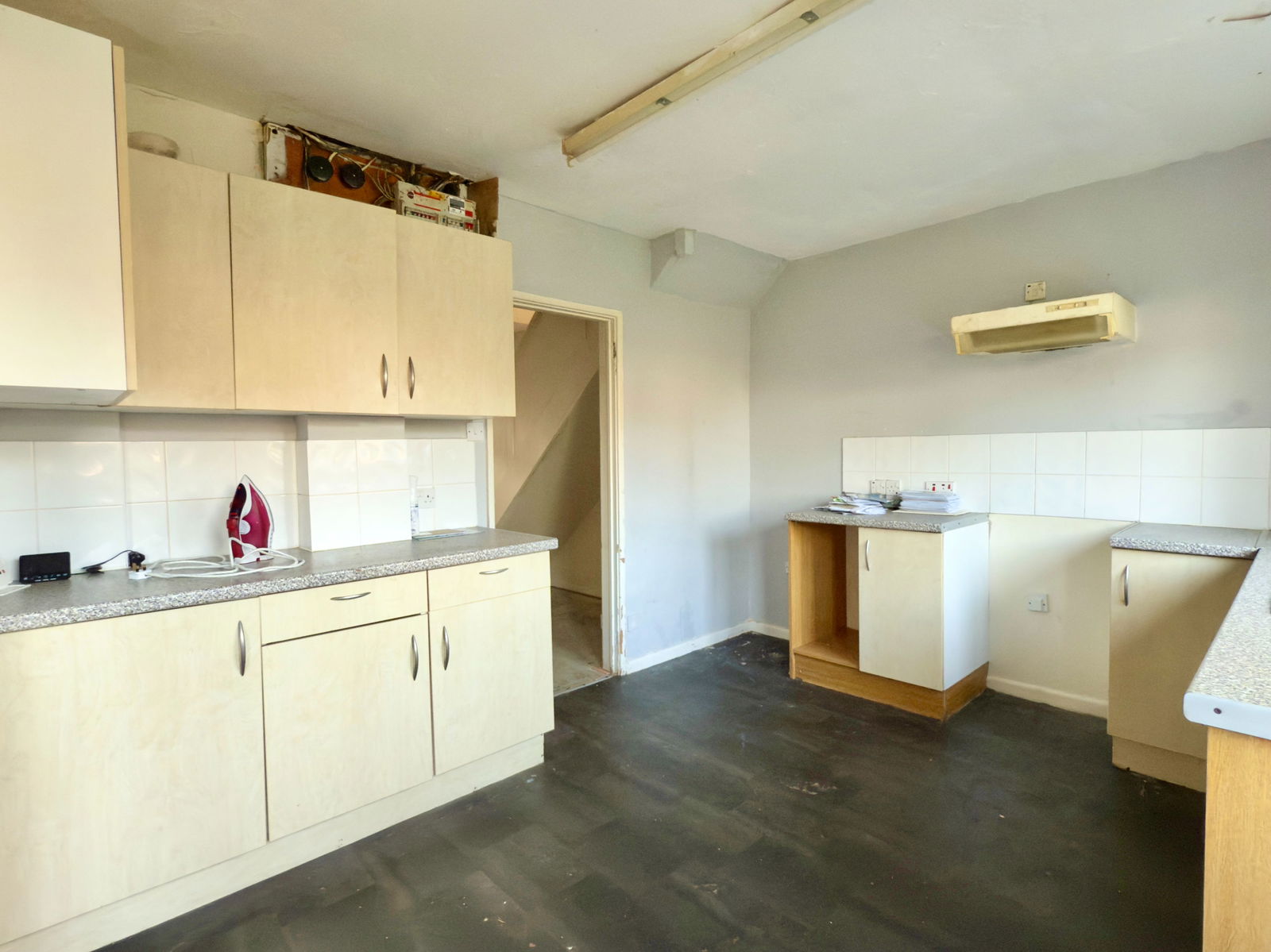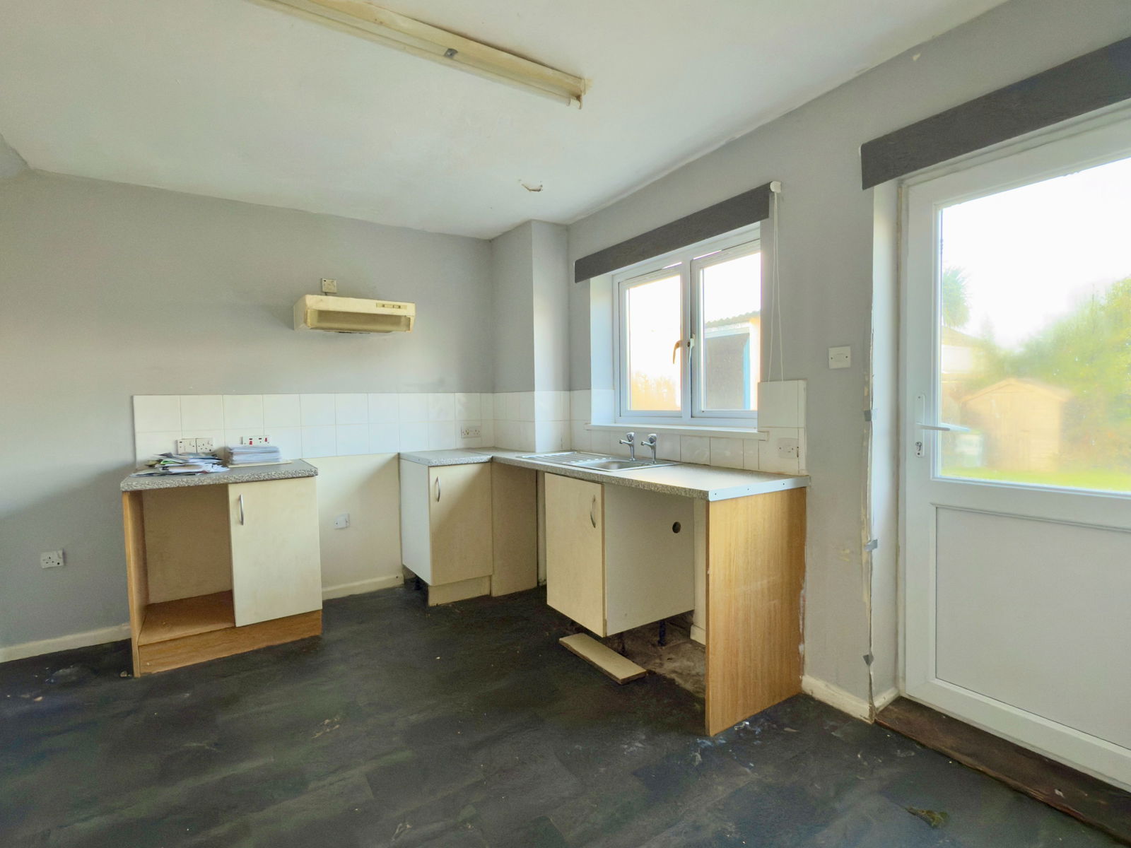 Double glazed window in door and UPVC frame to rear, base cupboards with worktops over and wall cupboards above, space and power for electric cooker, space and power for fridge and space for washing machine. Stainless steel sink unit, radiator.