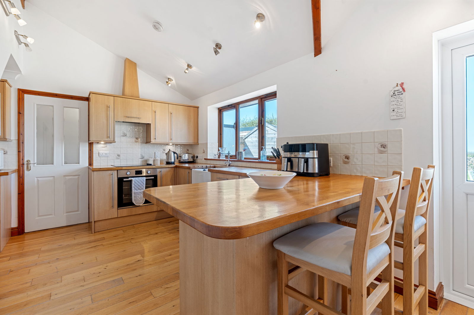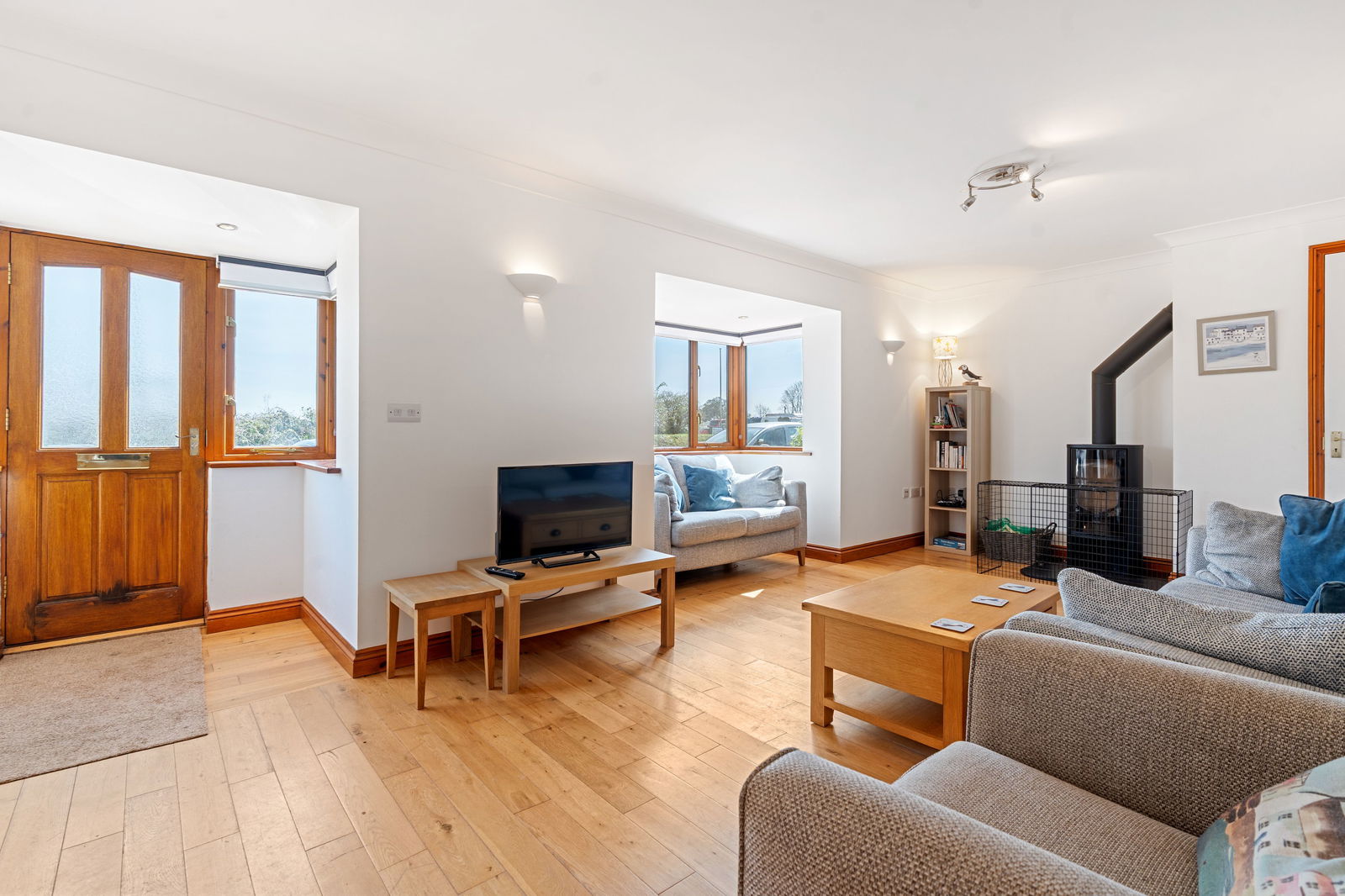 The front driveway is gravelled and offers plenty of parking. The property generally has a very spacious feel throughout having been mostly rebuilt in 2004. The front door leads into the large double bay fronted sitting room with feature wood burner. Oak flooring runs throughout the ground floor of the property. The central hallway is also double width and has a clear glass block wall to allow natural light in. This combined with glazed French doors which lead into the kitchen/diner at the rear of the property all help make the property nice and light. The kitchen worktops are solid wood and compliment the Oak flooring and set off the Belfast sink. French doors lead out to the south/west facing rear garden. The kitchen also returns under the stairs so there is a lot of storage available. Off the kitchen is a utility with a second Belfast sink and plumbing for a washing machine, space for a tumble dryer and the oil fired boiler. Door leads out to the rear garden. Also off the utility is a wet room with shower, WC and handbasin.