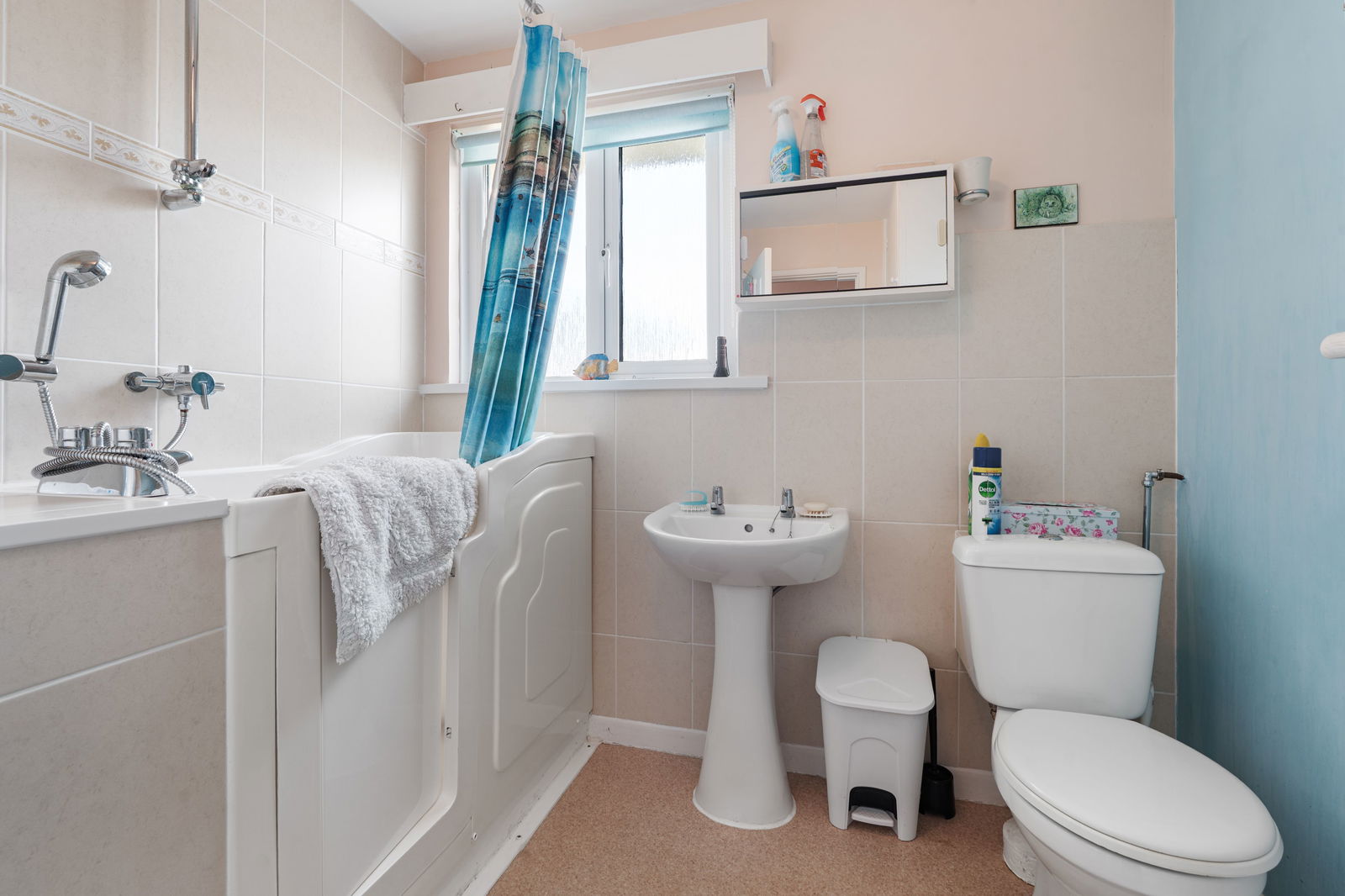 With disabled bath/shower and fully tiled surround. Low level W.C.. Wash hand basin. Window to rear. Built-in airing cupboard with lagged tank and shelving over.