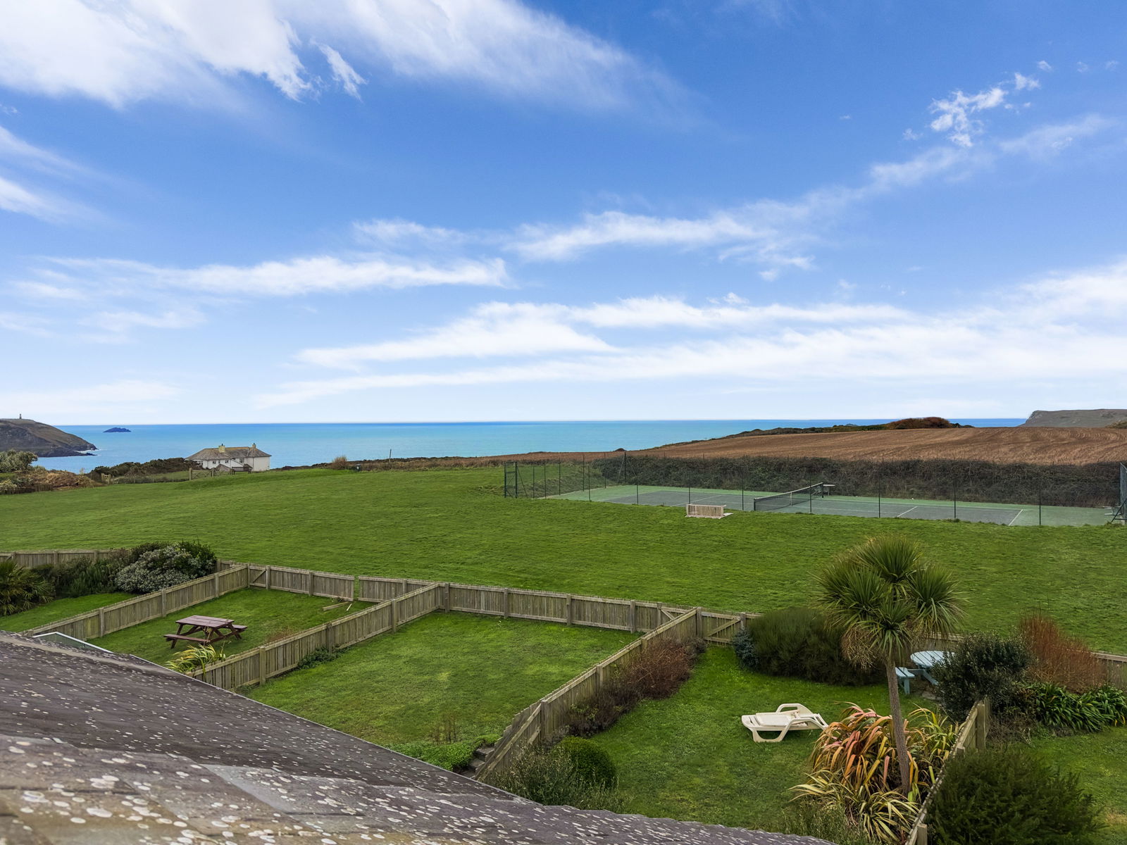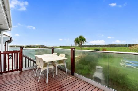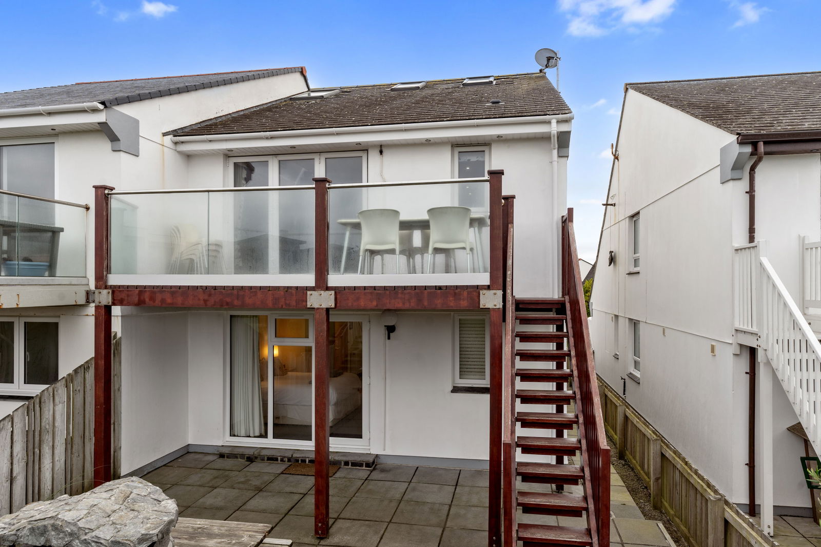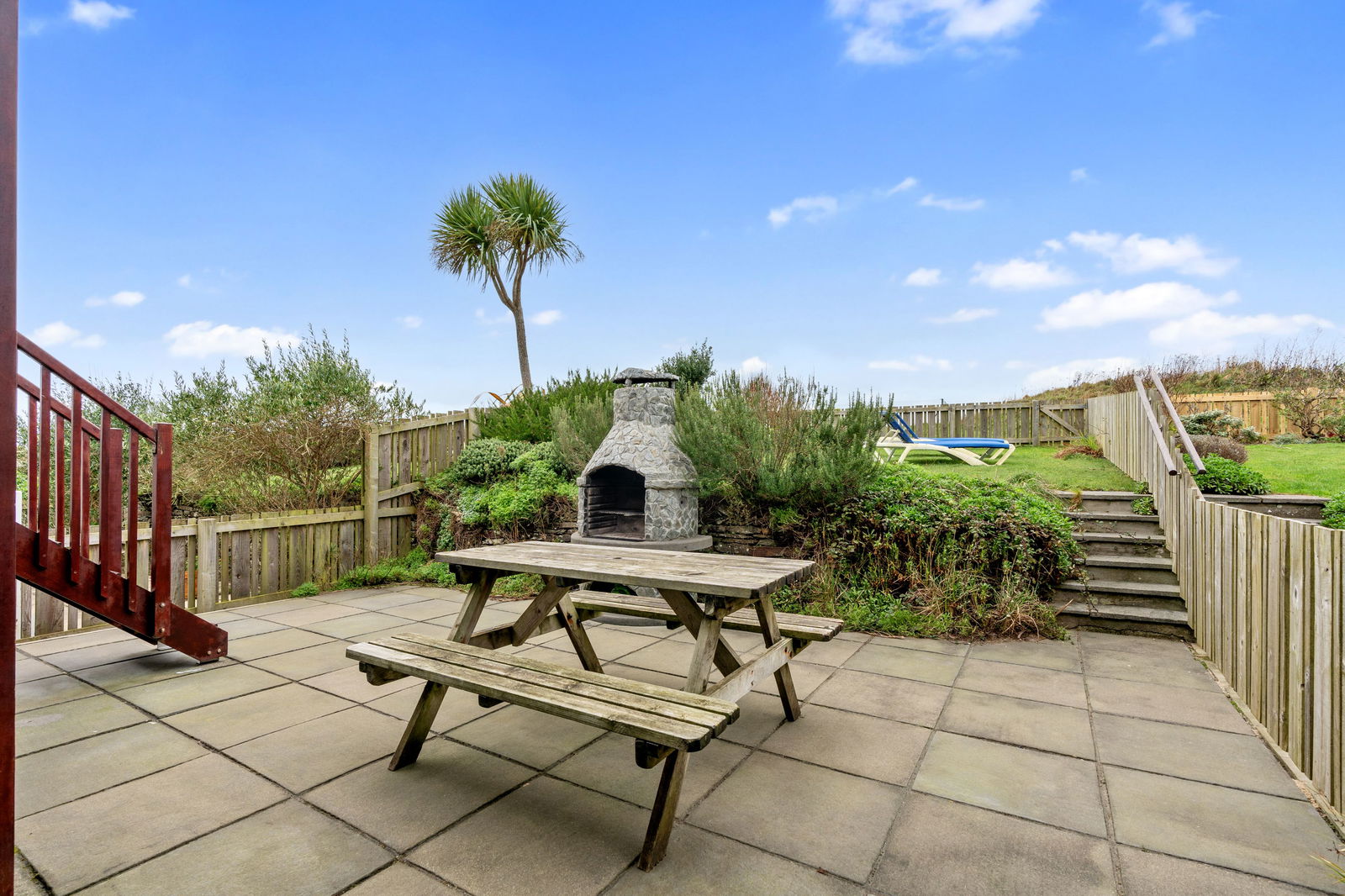 - Private rear garden with sheltered patio and BBQ with steps up to raised lawn area.