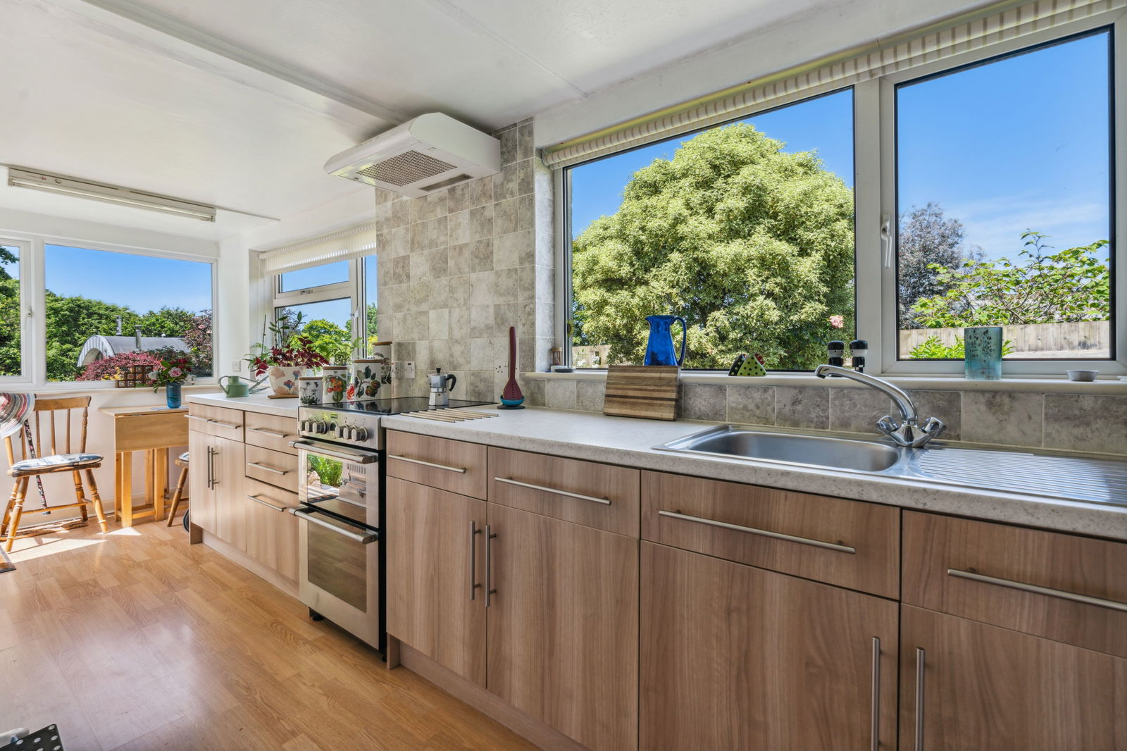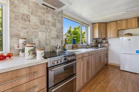 UPVC double glazed window. Built in units. Space and plumbing for washing machine. Space and power for tumble dryer. Stainless steel sink. Radiator. Double glazed timber door out to front and side gardens.