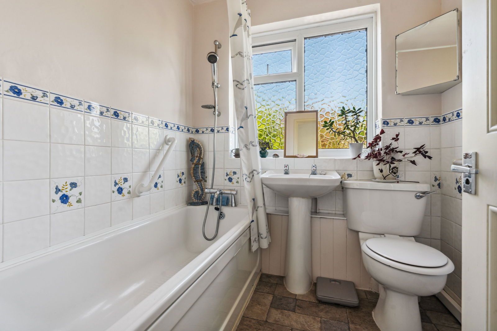 Bath with shower over. Vanity wash hand basin. Low level w.c. Towel rail. UPVC double glazed window. Dimplex heater. Extractor fan.