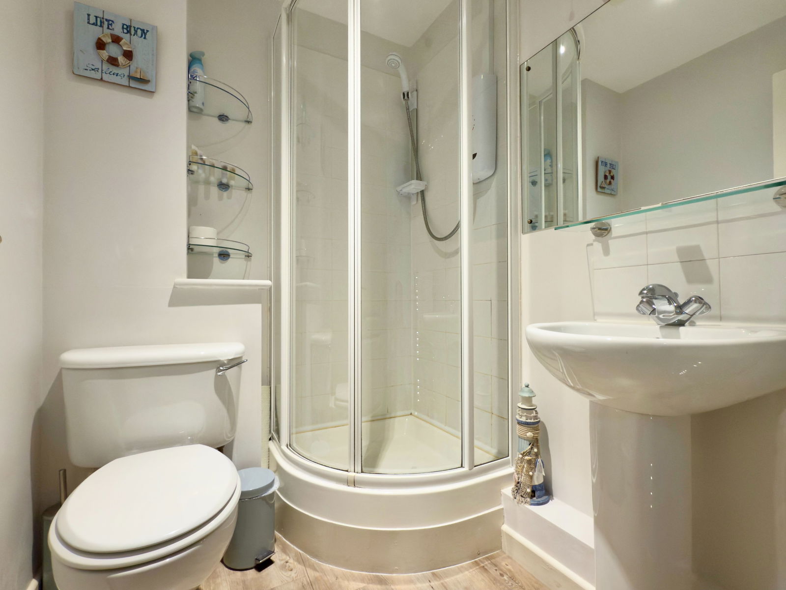 Shower cubicle with independent electric shower, fully tiled walls, low level W.C., wash hand basin, radiator.