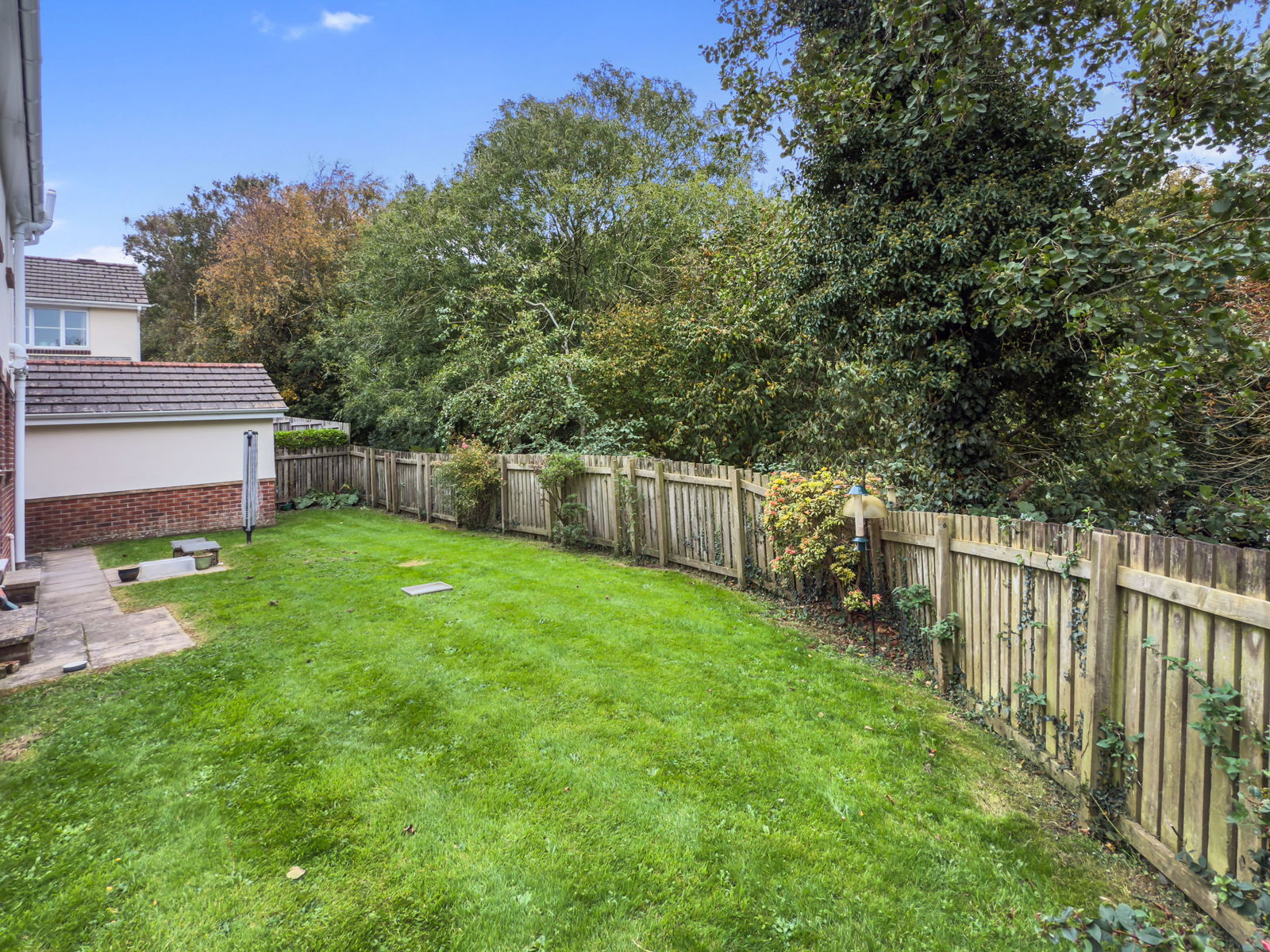 The rear garden is laid to lawn with timber fence beyond enjoying a really private position. Gated access to side. 2 patio areas. Outside power point. Enjoying views through the woodland towards the countryside beyond.