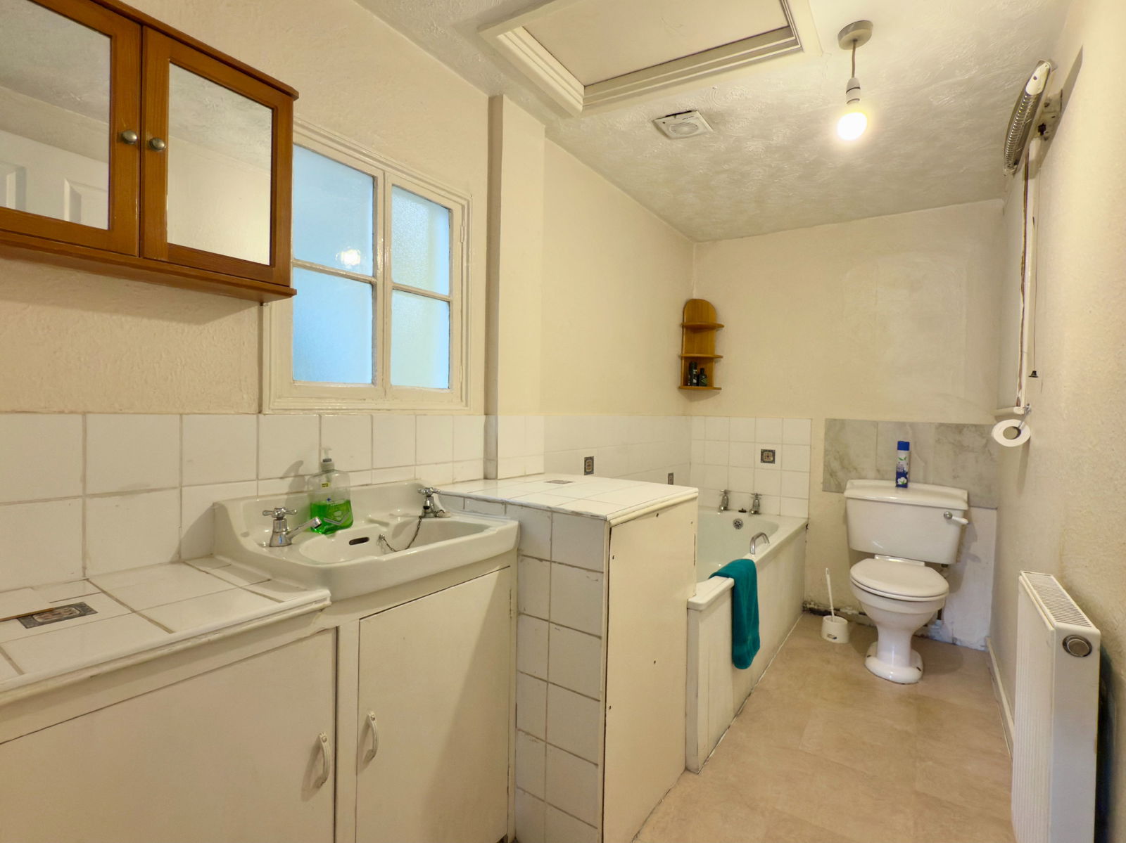 Window to landing, panelled bath with tiled surround, low level W.C., wash hand basin with storage cupboard below, radiator, loft hatch.