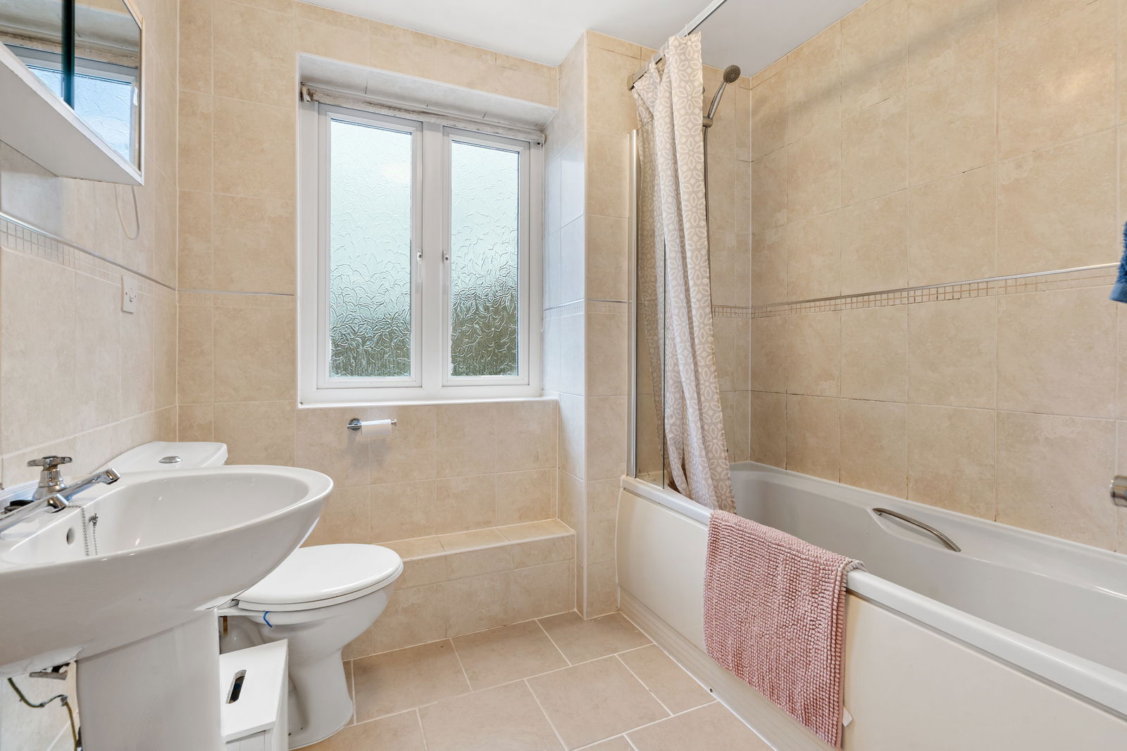 Fully tiled walls and flooring. Panelled bath with shower over. Low level w.c. Wash hand basin. Electric wall mounted fan heater. Window to front.