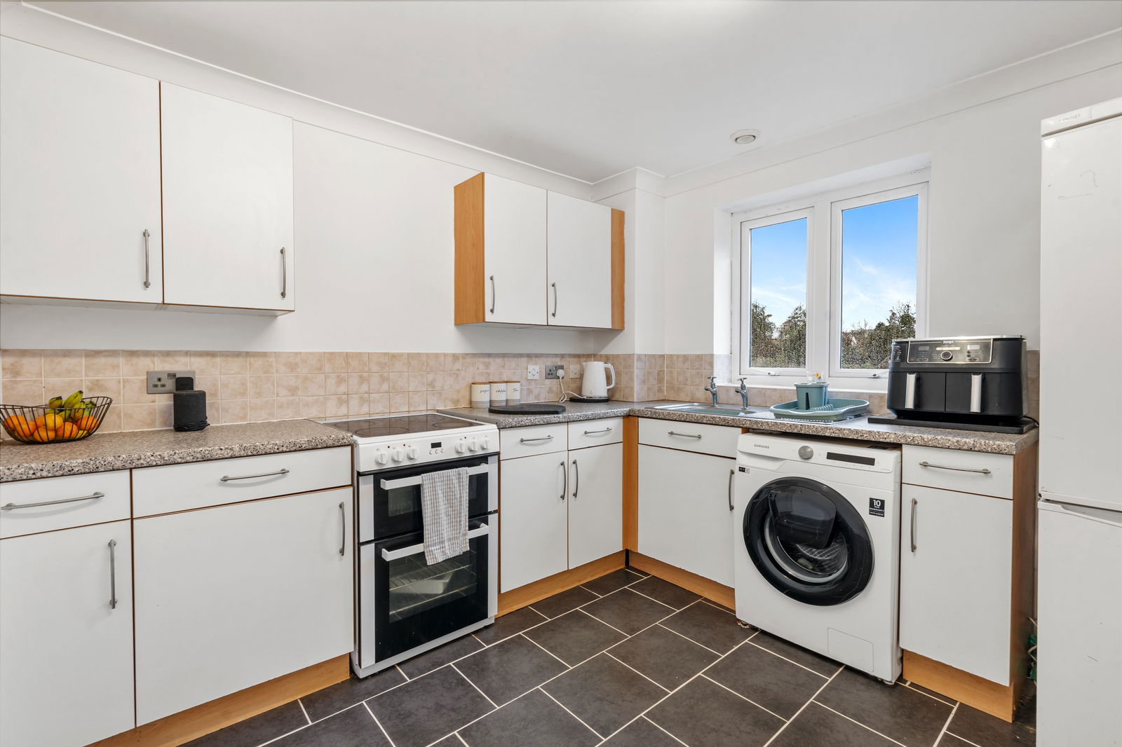 Single drainer stainless steel sink unit. Good range of built in base and wall units including drawers. Roll edged worktops with tiled surrounds. Space for electric oven. Recess for fridge/freezer. Space and plumbing for dishwasher. Tiled floor. Window to front.
