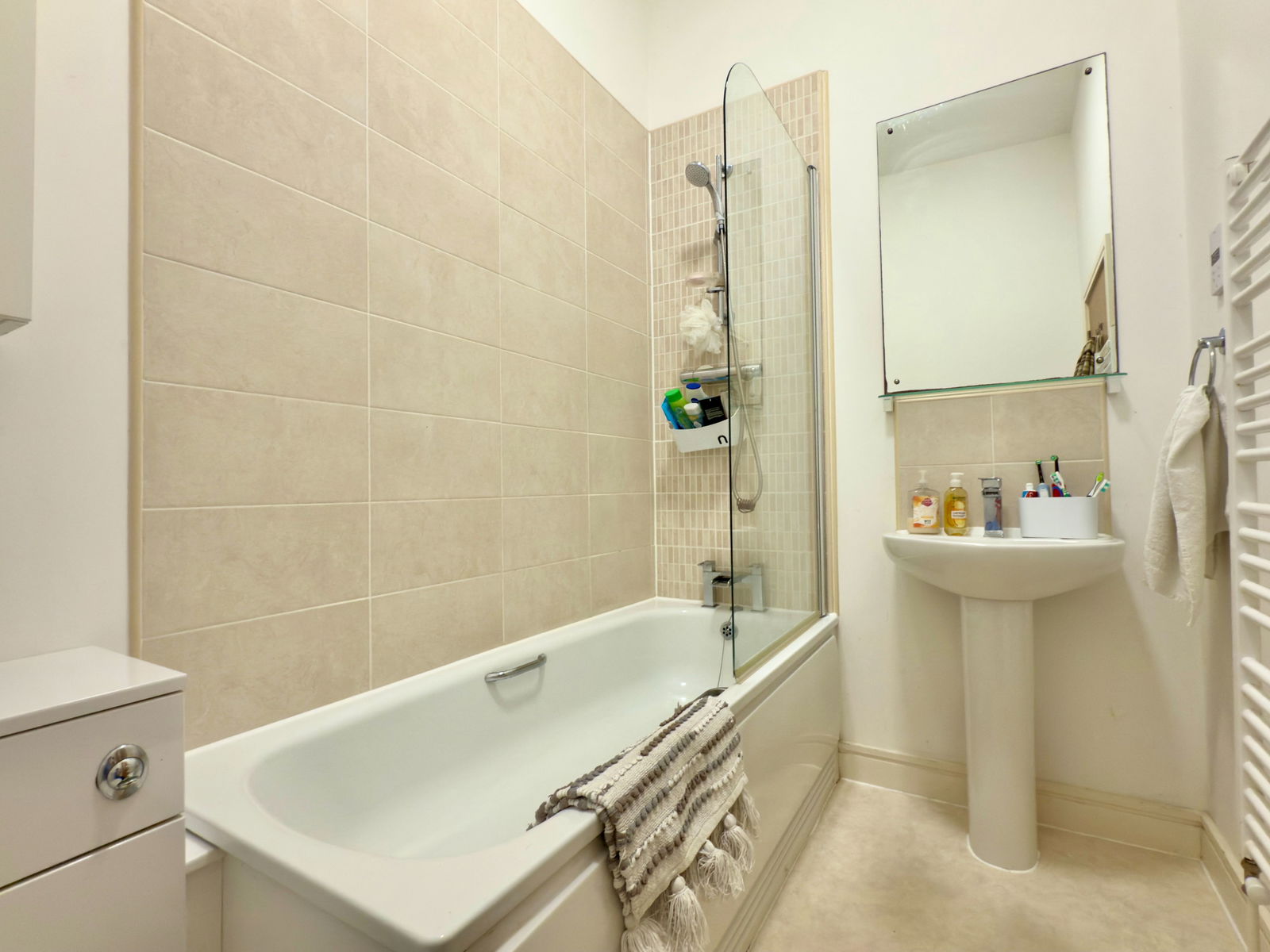 Modern white suite comprising panelled bath with shower over, fully tiled surround, glazed shower screen, low level W.C., wash hand basin with tiled splashback, mirror, shaver socket and heated towel rail.