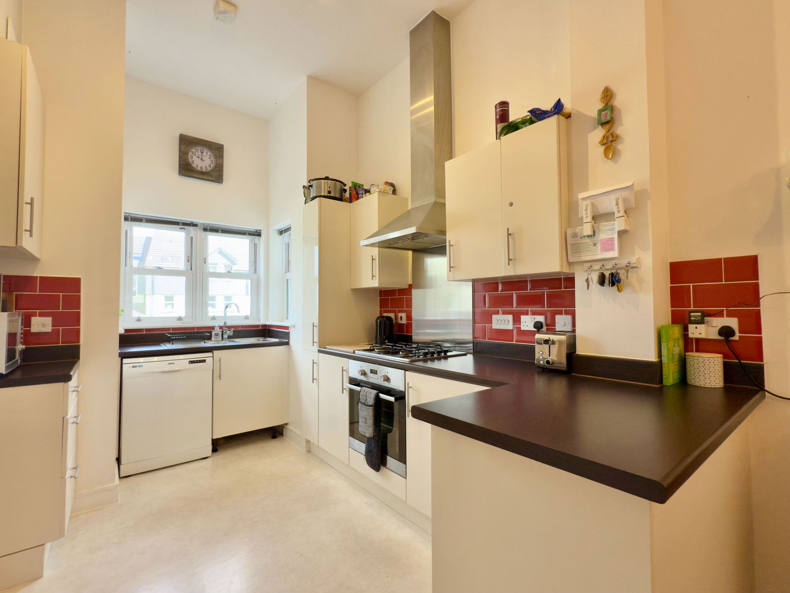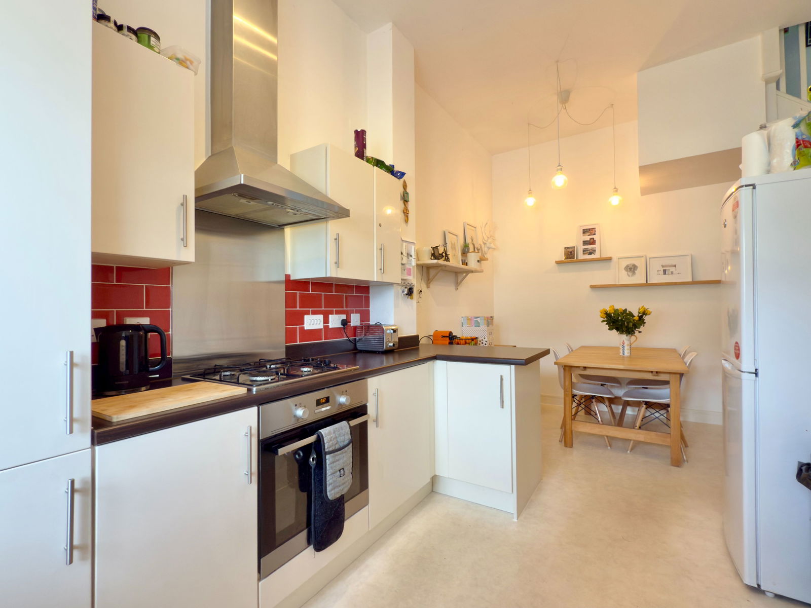 A modern fitted kitchen with a good range of wall and base cupboards with drawers and worktops over, integral oven with 4 ring gas hob and extractor fan over, one and a half bowl stainless steel sink with mixer tap over and tiled surrounds, space and plumbing for dishwasher, cupboard housing Baxi gas fired central heating boiler, UPVC double glazed bay window to front with sash windows framing some nice views, understairs storage cupboard, lovely high ceilings giving the feel of spaciousness. Stairs lead up to