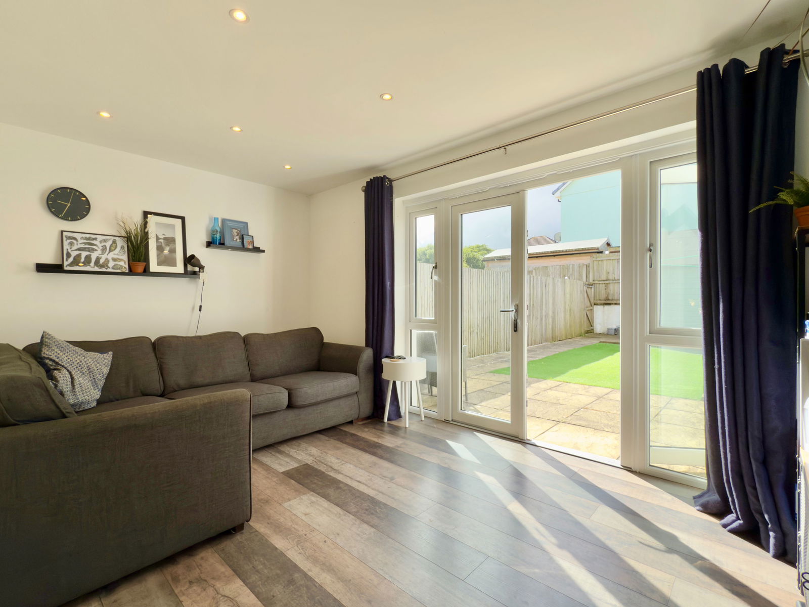 A lovely light living room with UPVC double glazed French doors with matching glazed side panels and windows opening on to rear garden, radiator.