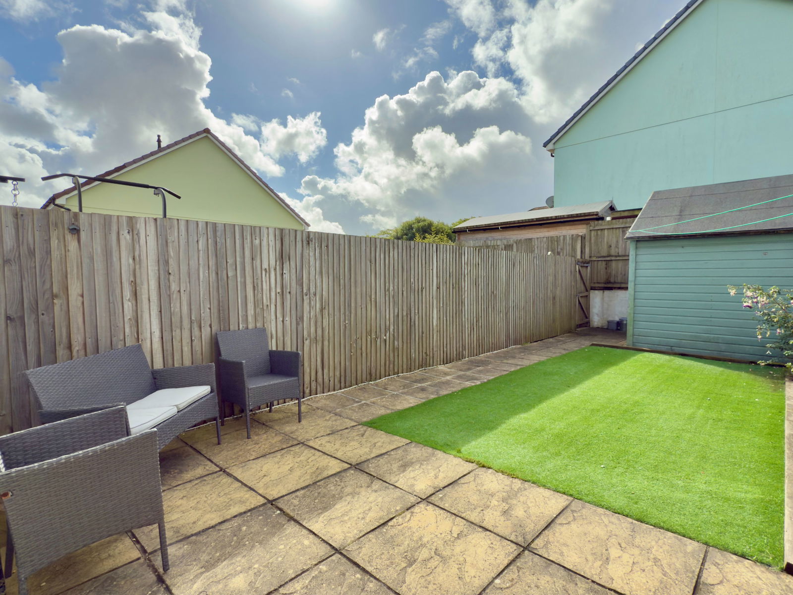 The garden is a fully enclosed fenced garden on both sides with artificial central lawn, slate path and patio area with planting beds to side and garden shed to rear. Pedestrian access and path leads to the front to back parking space for 2 cars.