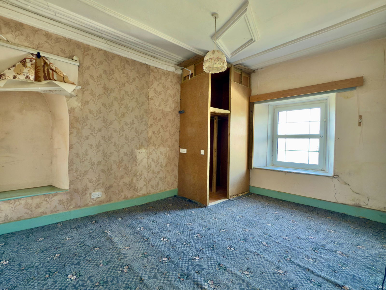 UPVC window to rear (seal perished), various built-in cupboards, one housing hot water tank with cold water tank above.