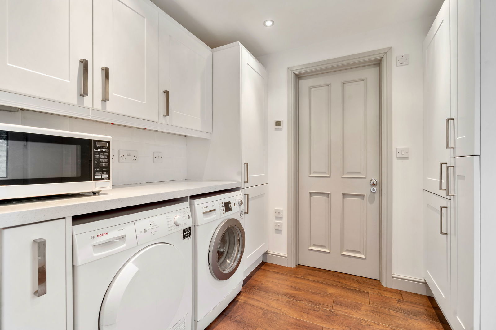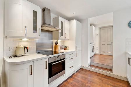 Space and plumbing for washing machine. Space and power for tumble dryer. Further generous storage space. UPVC double glazed side door out to rear garden and patio.