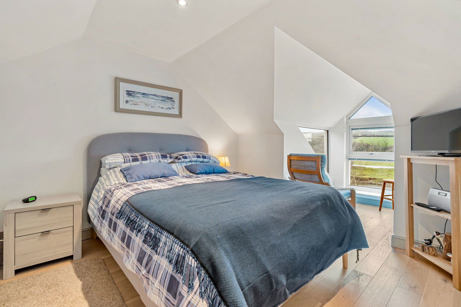 A generous master bedroom with double glazed UPVC dormer window perfect for sitting and enjoying the views over the Camel Estuary and beyond. Generous eaves space and built in wardrobes. Radiator. T.V. point.