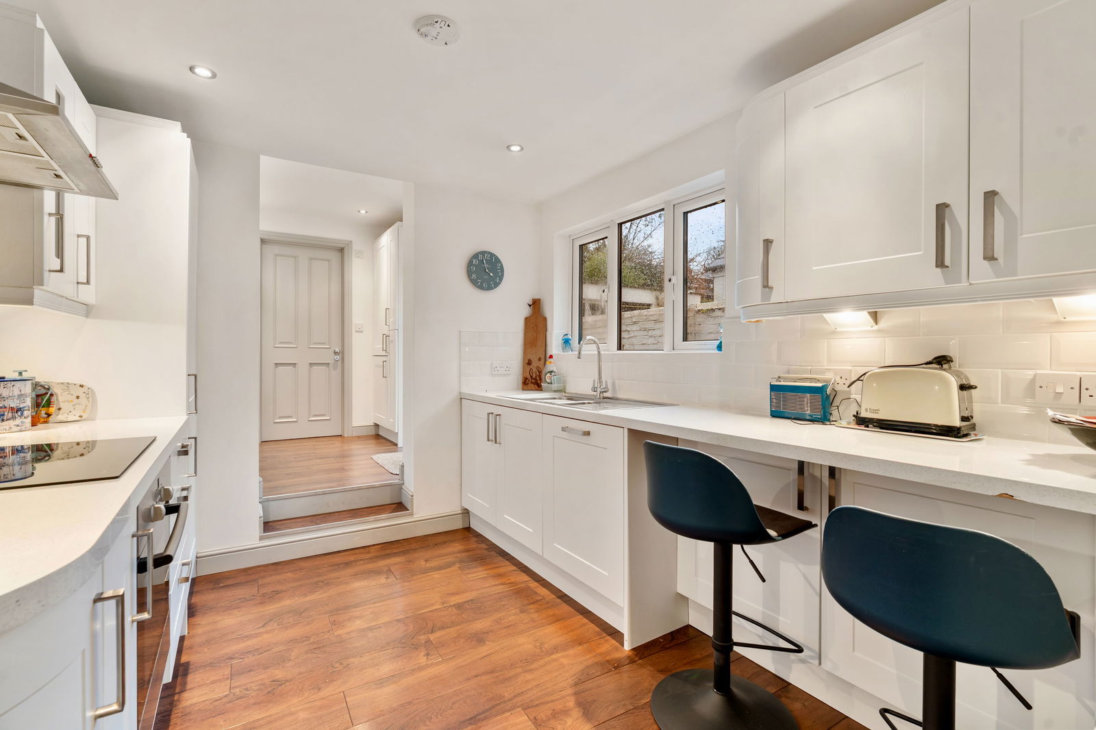 Fully equipped modern kitchen. Radiator. Generous worktop space. 4 ring Neff induction hob with stainless steel extractor, Bosch oven and grill. Integrated fridge/freezer. Stainless steel sink with tap. Integrated Bosch dishwasher. UPVC double glazed window. Step up to