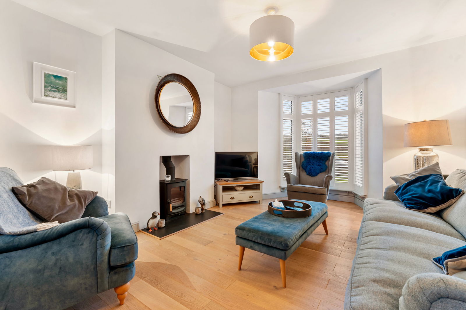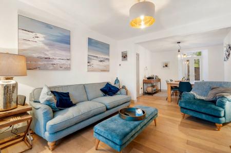 A generous modern open plan living/dining room. Living area to front with UPVC double glazed bay window with recently fitted shutters. T.V. point. Recently fitted woodburner. Generous entertaining area. The dining area comprises of a radiator, UPVC double glazed French doors leading out to rear patio and garden, further storage space. Space for large table and chairs.