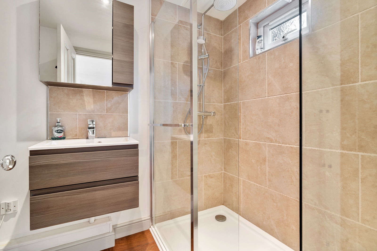 A modern fitted suite with double shower, UPVC double glazed window, extractor fan, wash hand basin with built in storage below, towel rail and low flush w.c.