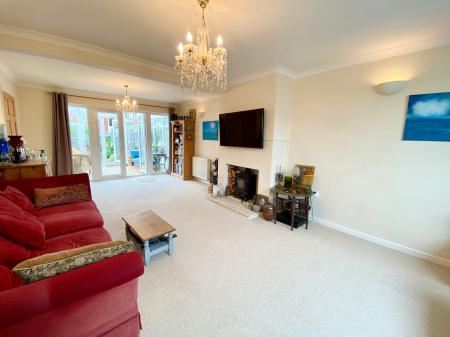 Again another lovely light dual aspect room, fireplace recess with woodburning stove, radiator, double French doors to
