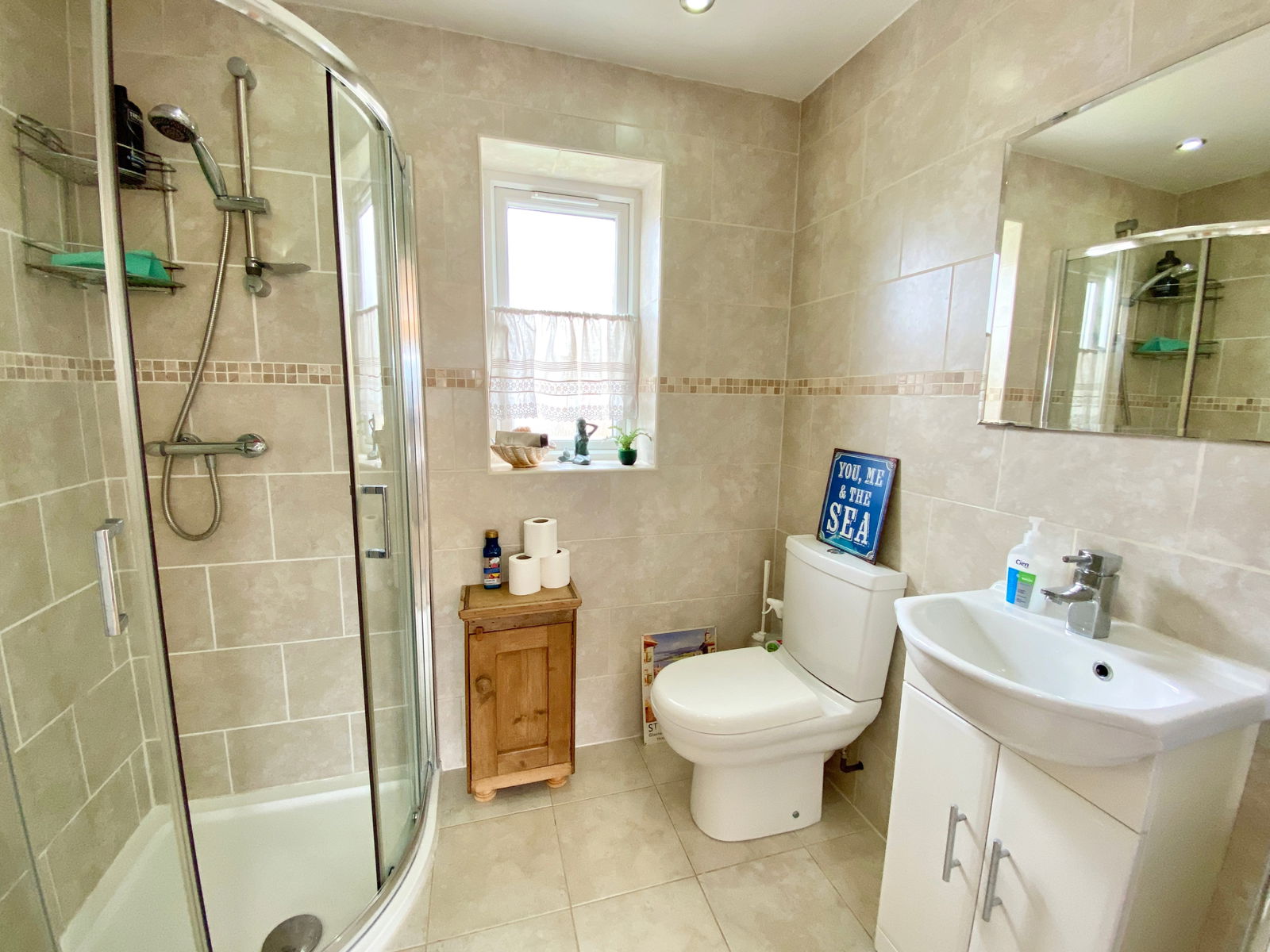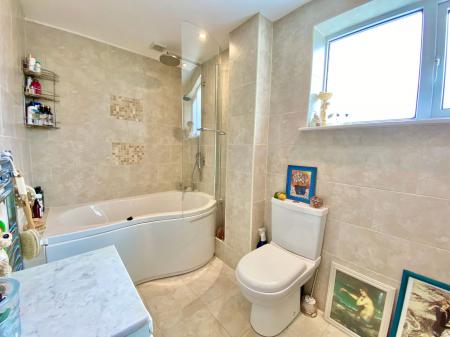Fully tiled, refitted suite with spacesaver bath with curved glazed shower screen, thermostatic shower above bath, low level W.C., wash hand basin with cupboard below, heated towel rail, underfloor heating.