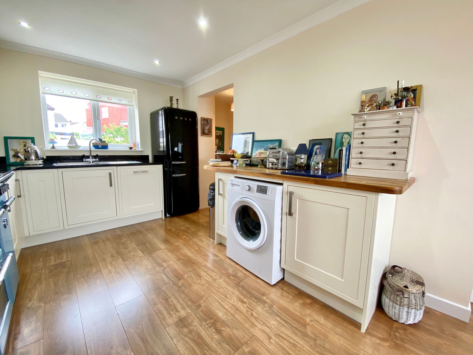 A lovely light dual aspect room with fully fitted modern kitchen comprising good range of built-in base and wall units including drawers, wine rack, glazed display cabinets, majority granite worktops with one solid timber worktop, inset one and a half bowl stainless steel sink, mixer tap over, recess for gas fired oven, arched glazed/stainless steel extractor hood over, integral dishwasher, space and plumbing for washing machine, space for fridge/freezer.