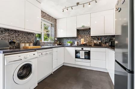 A modern fitted kitchen with an excellent range of wall and base cupboards with drawers and worktops over. Integral Bosch oven with 5 ring Neff gas hob with extractor fan over. One and a half bowl stainless steel sink with mixer tap over. Space and plumbing for washing machine. Space and plumbing for dishwasher. Space and power for fridge/freezer. Ample dining space. Radiator. Understairs storage cupboard. Door to
