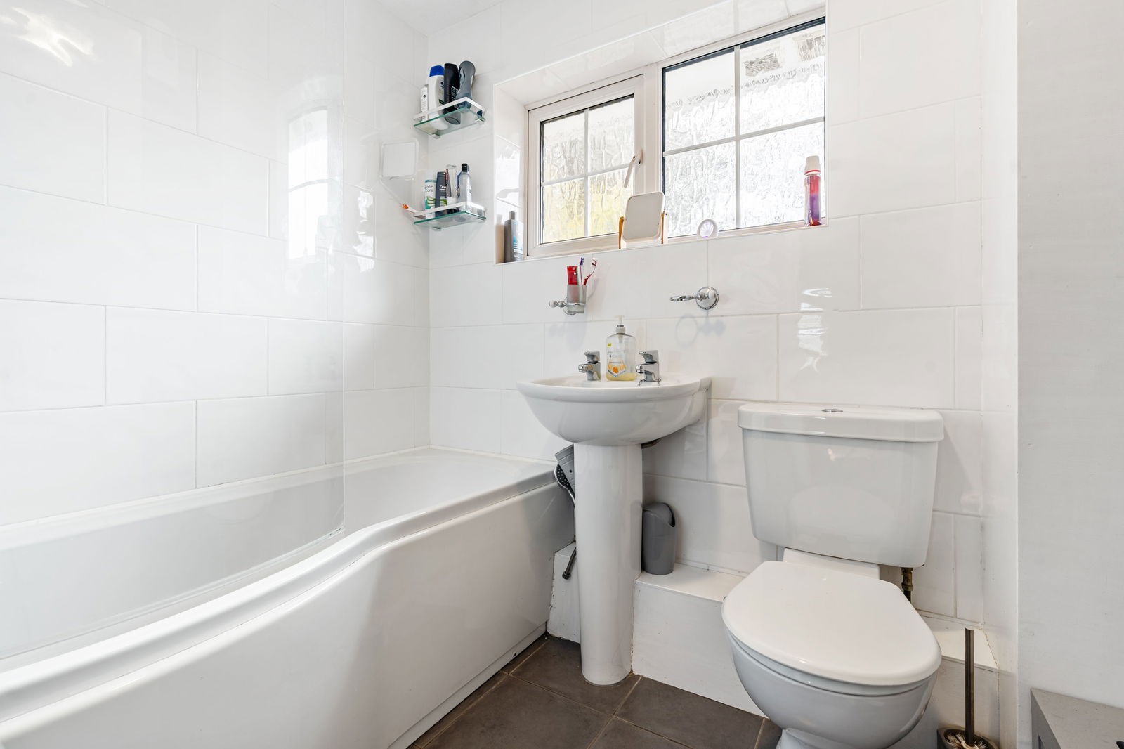 Low level W.C., wash hand basin, tiled splashback, window to front, electric circuit breakers.