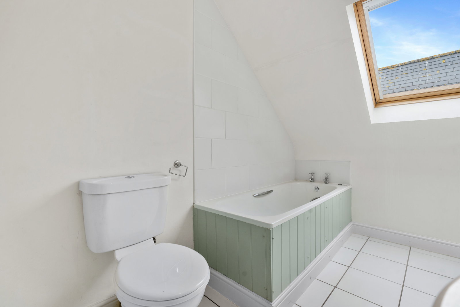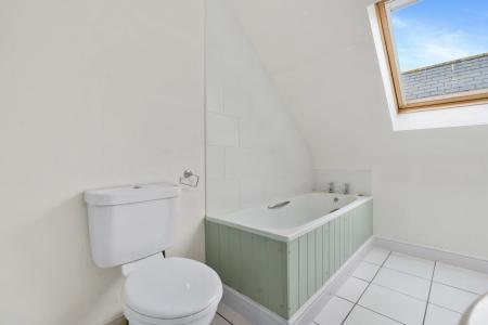 Again slight restricted head height. White suite comprising panelled bath with tiled surround. Tiled floor. Wash hand basin with tiled splashback. Low level w.c. Velux skylight. Heated towel rail. Cupboard housing Worcester Green Star gas fired central heating/hot water boiler.