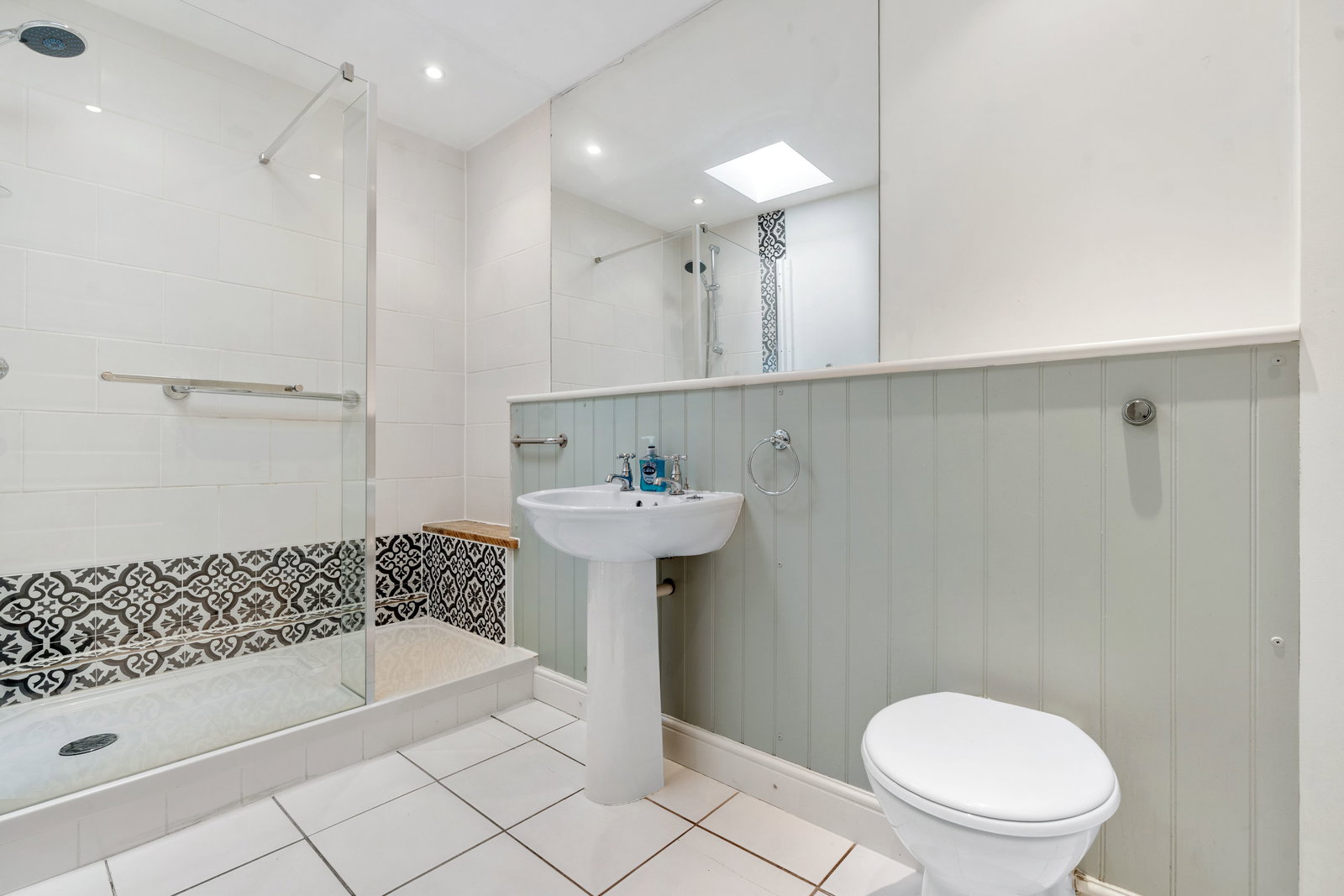 Fully tiled large shower enclosure with thermostatic shower and glazed screen. Wash hand basin. Concealed cistern w.c. Extractor fan. Heated towel rail. Velux skylight.