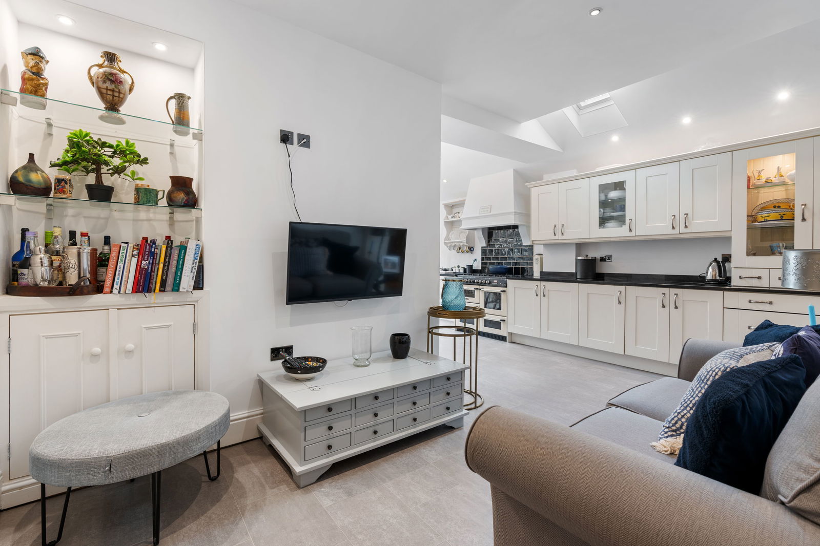 3 Velux roof windows and double glazed bi-fold doors opening onto the private walled garden. The kitchen is fitted with a range of modern units comprising base cupboards with granite worktops over and wall cupboards above. Integral Range cooker with extractor hood over together with integral dishwasher. Space and power for American style fridge. Butler style sink unit and mixer tap. 2 radiators. Door to entrance hall.