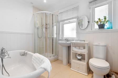 Fitted in white suite comprising scroll top bath, corner shower cubicle, pedestal wash hand basin and low flush w.c. Heated towel rail. Tiled floor. 2 opaque pattern double glazed windows in UVPC to side.
