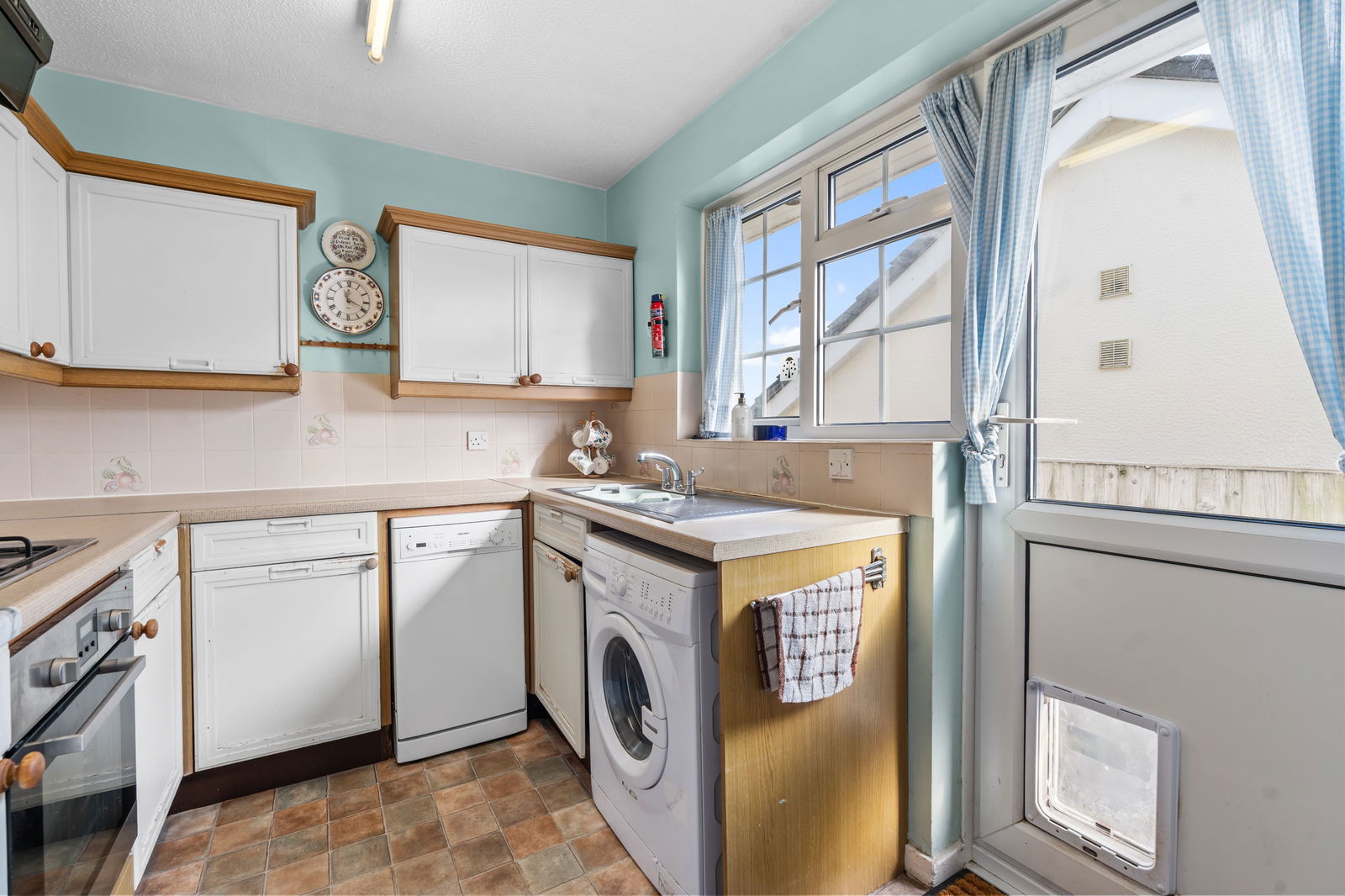 Fully equipped kitchen with generous floor and wall cupboards, space and plumbing for slimline dishwasher, space and plumbing for washing machine, Hotpoint oven and grill with 4 ring gas hob, extractor fan over, stainless steel sink with UPVC double glazed window and UPVC double glazed door to side, storage cupboard with consumer unit and solar panel inverter.