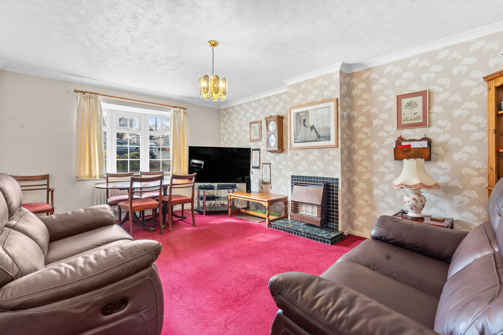 Generous living room with UPVC bay window to front, radiator, original electric fire, T.V. point, generous entertainment space.