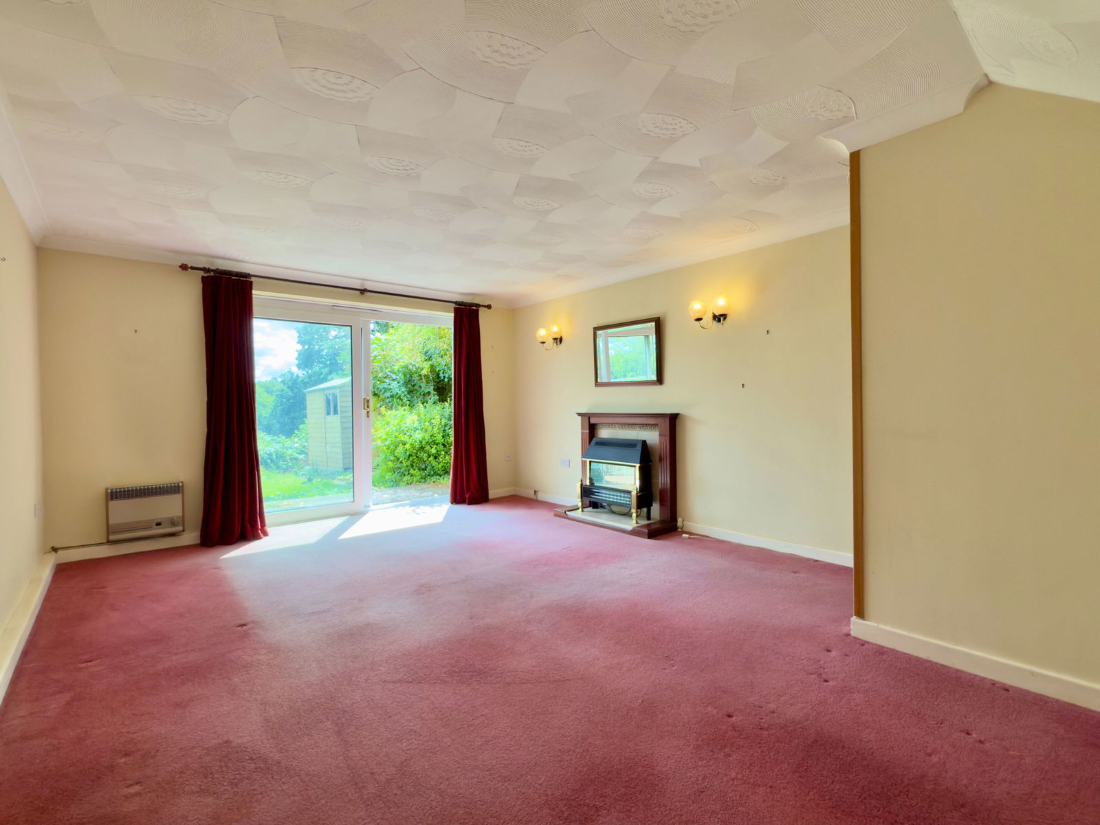 Generous living room with T..V. point, electric fireplace, original gas radiator, UPVC double glazed sliding doors out to garden and patio.