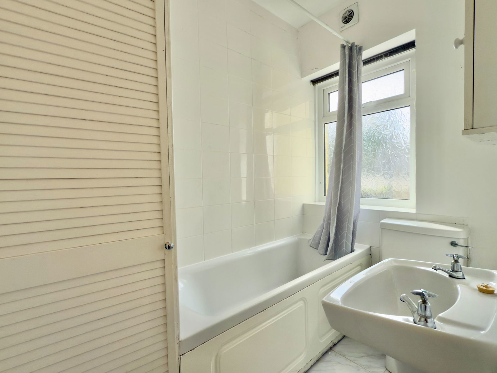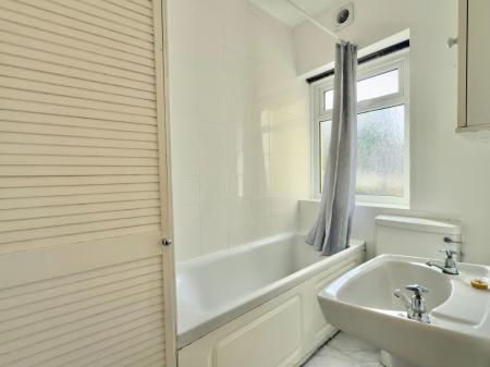 Panelled bath with electric shower over. Opaque UPVC double glazed window to front. Low level w.c. Wash hand basin. Heated towel rail.
