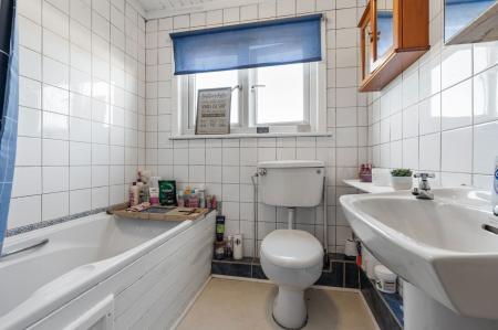 White suite comprising panelled bath, fully tiled walls, Triton independent electric shower over bath, low level W.C., wash hand basin, UPVC double glazed window to rear.