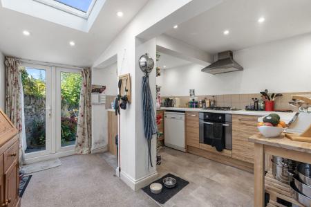 Comprising single drainer stainless steel sink, mixer tap over, range of built-in base units including drawers, roll edged worktops with tiled surrounds, space and plumbing for washing machine, dishwasher, built-in electric oven, gas 4 ring hob, stainless steel hood over, inset ceiling spotlights, UPVC window and double glazed French doors onto rear garden (see later).