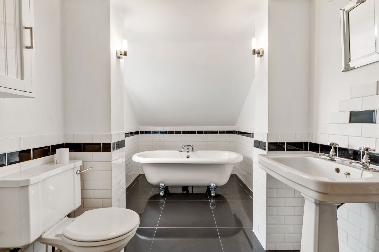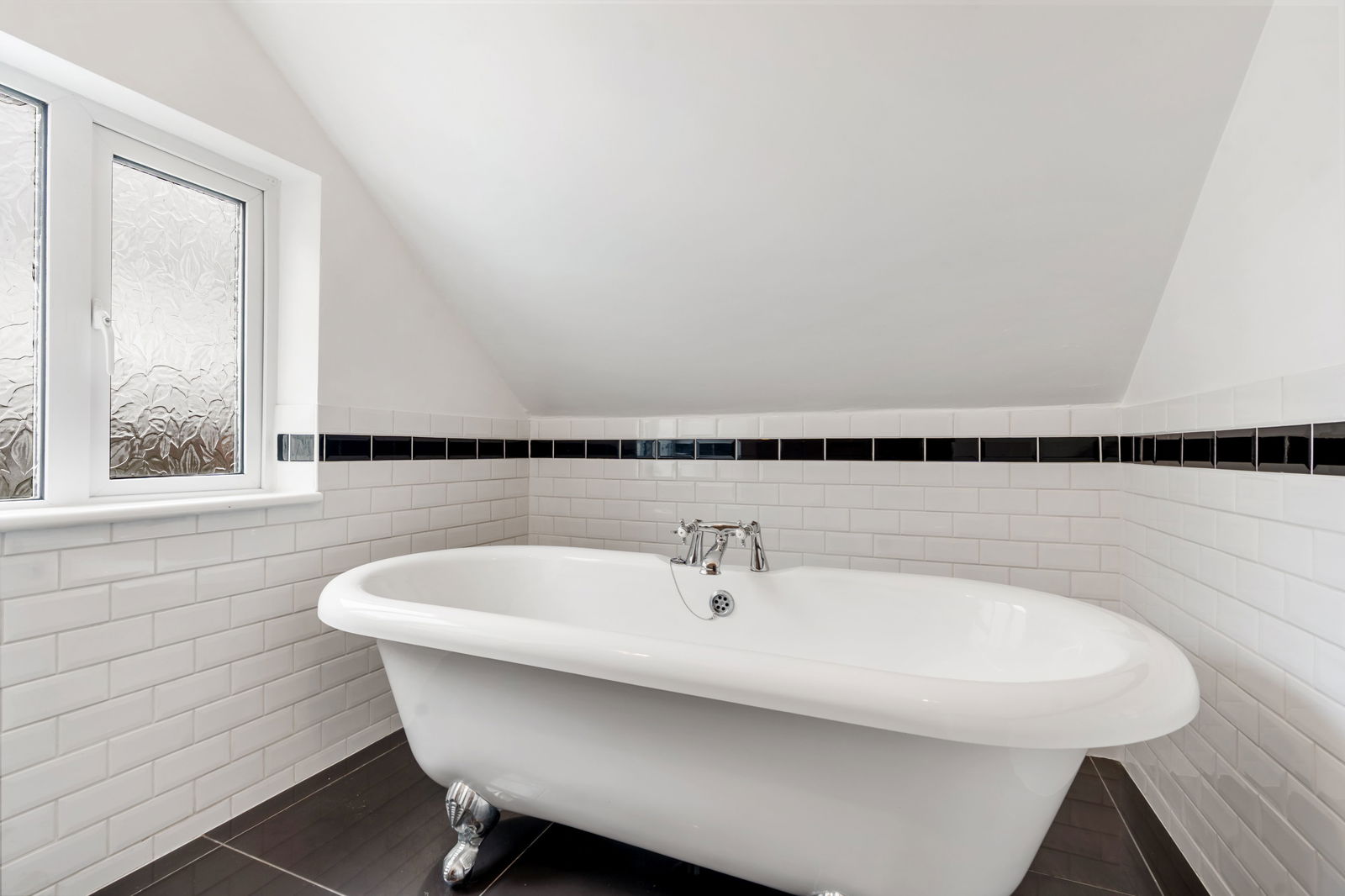 A large family bathroom with freestanding bath, low level w.c., wash hand basin, large vertical heated towel rail and corner shower cubicle with rainfall shower head. Opaque UPVC double glazed window to side.