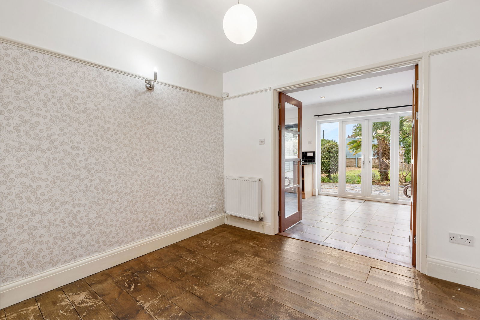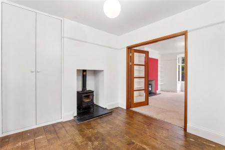 Wooden flooring. Woodburning stove set on slate hearth. Radiator. Storage cupboard. Picture rail. Double doors opening to