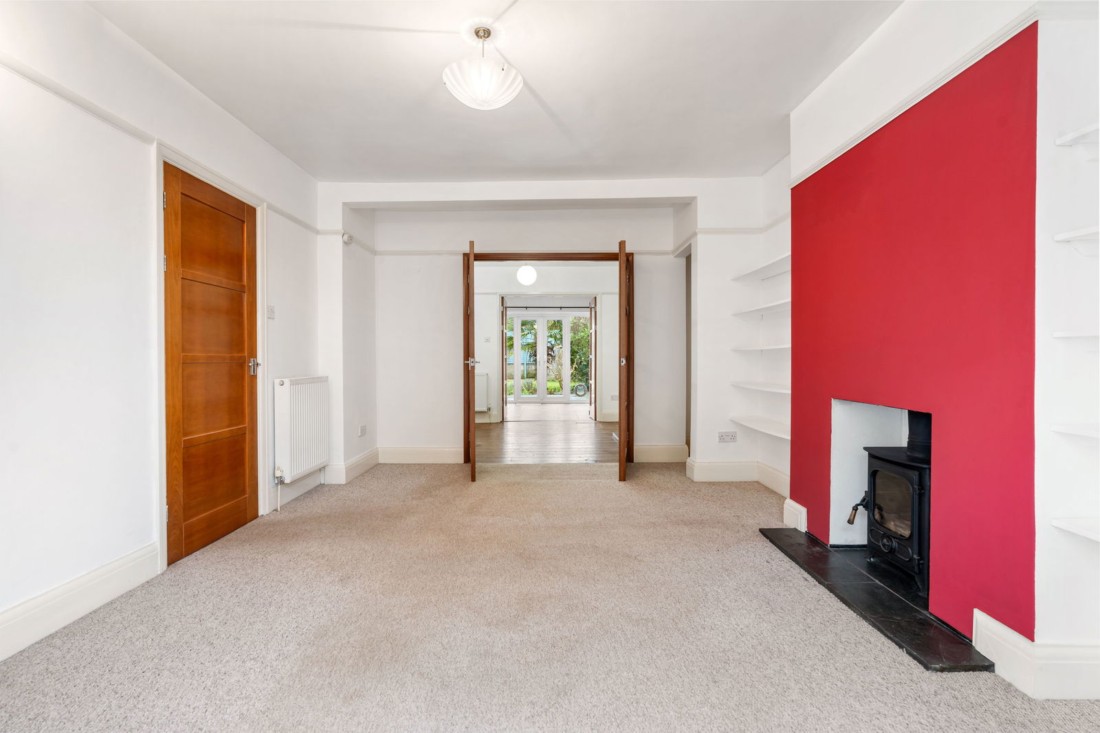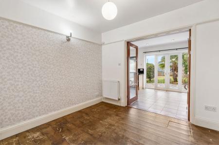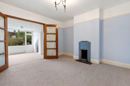 A lovely room with UPVC double glazed bay window to front. Woodburning stove set on slate hearth with recessed shelving. Picture rail. 2 radiators. Double doors opening through to