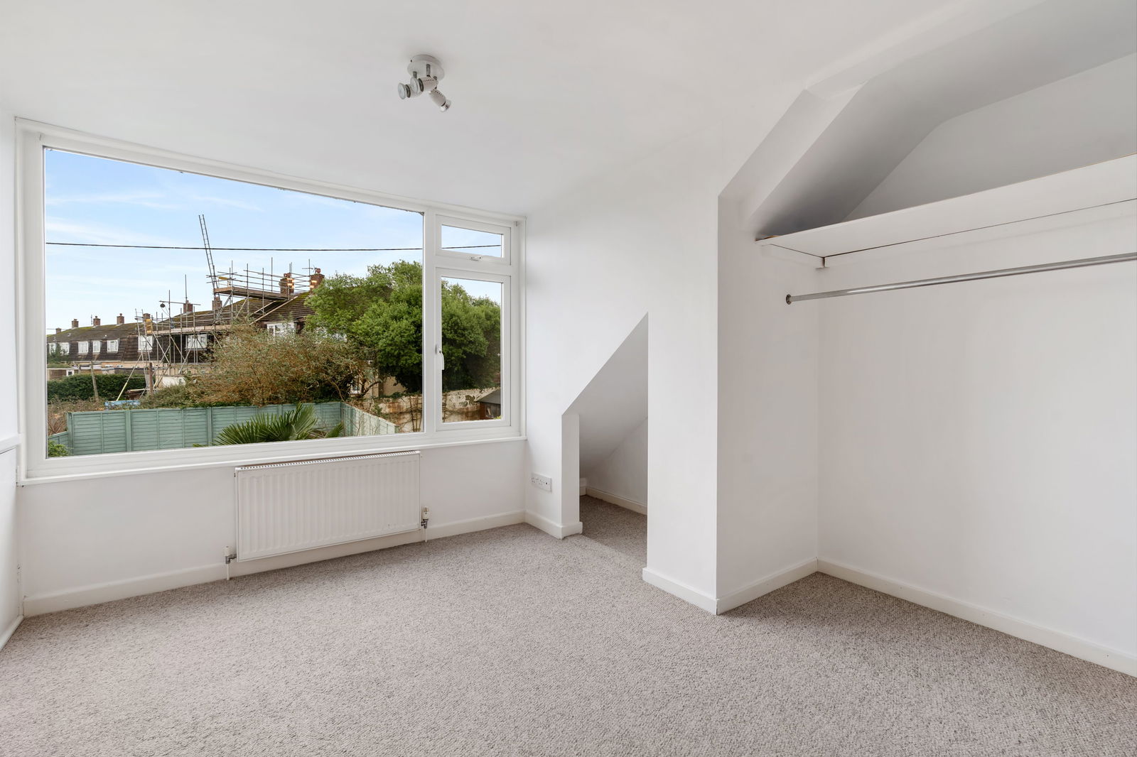 A superb master bedroom featuring picture rail, feature former fireplace, 2 radiators, UPVC double glazed window overlooking the rear garden, eaves storage space, hanging rail with shelf above.