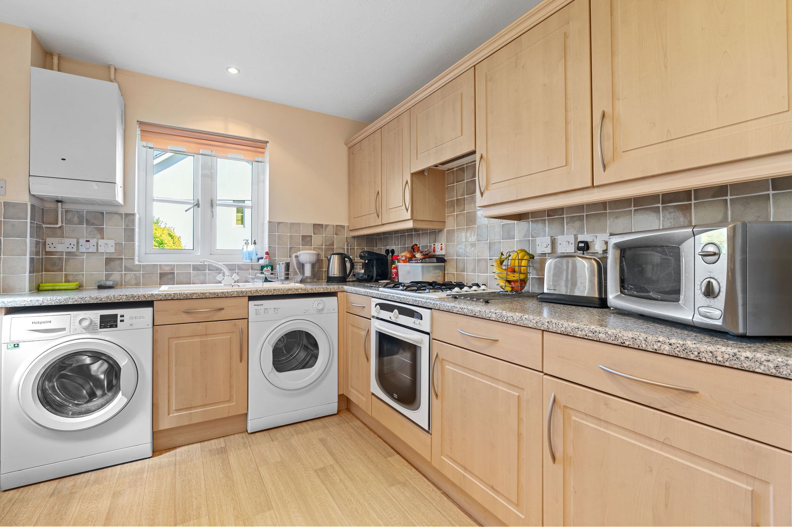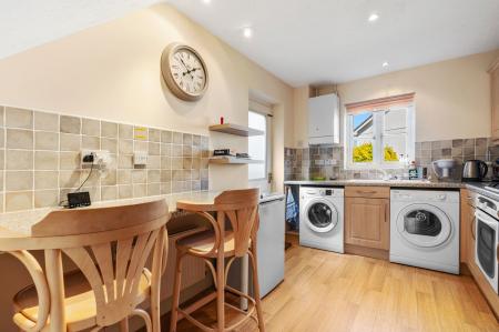 Single drainer sink unit with mixer tap over, good range of built-in base and wall units including drawers, fitted worktops with tiled surrounds, built-in Creda electric oven, Creda 4 ring gas hob, filtration hood over, space and plumbing for washing machine, breakfast bar, radiator, gas fired central heating/hot water boiler, window overlooking the rear garden and part glazed door to outside.