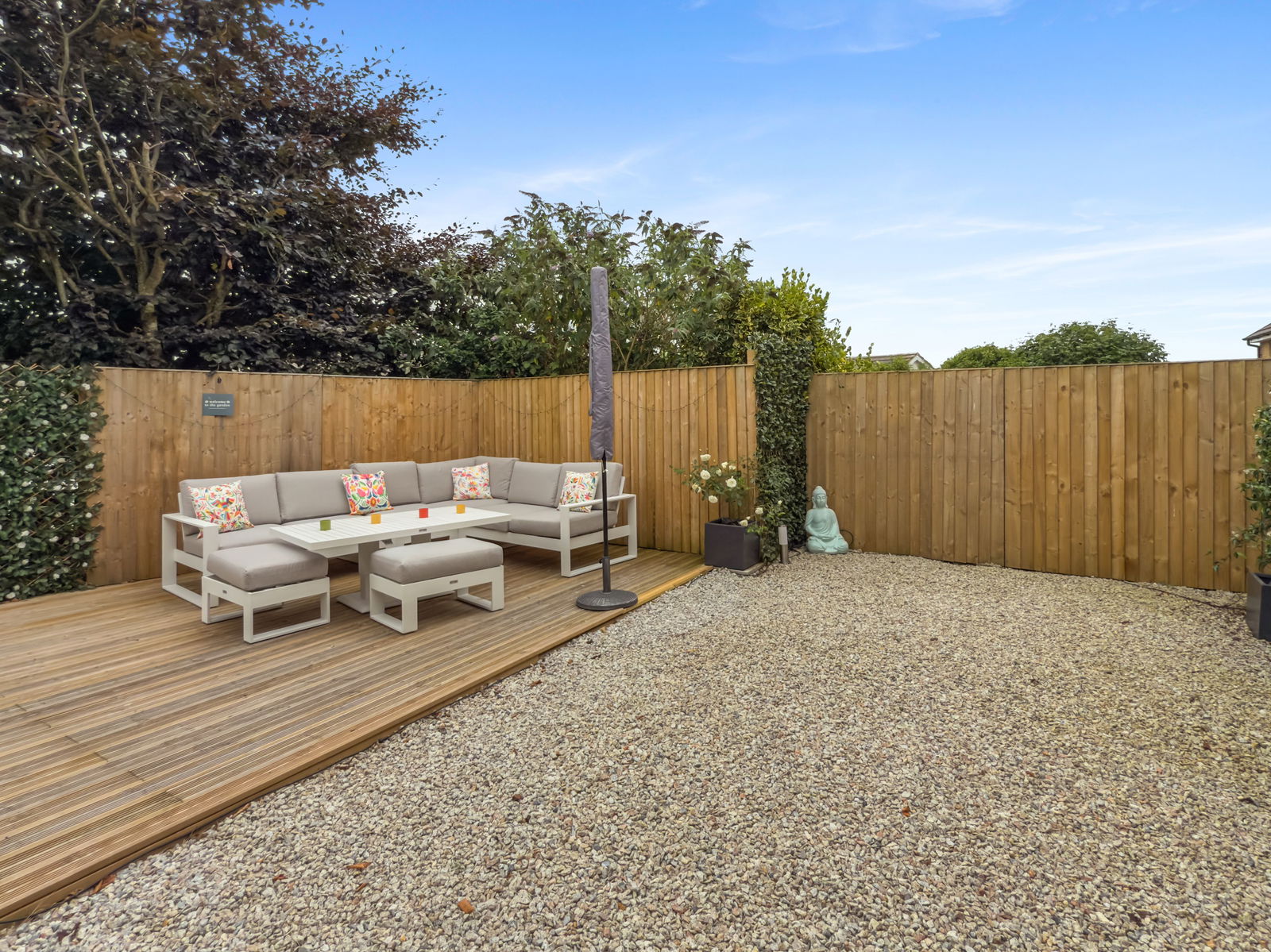 Well thought out garden with raised patio area, perfectly positioned for morning coffee. Steps lead to a lawned area, pebble area and new decking, perfect for entertaining.