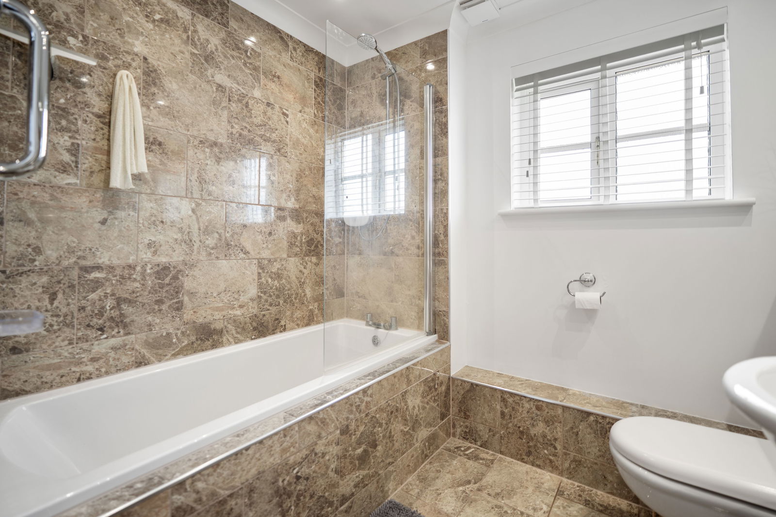 UPVC double glazed window to rear. Low flush w.c. Wash hand basin. Stainless steel towel rail. Bath with new shower over. Extractor fan. Modern tiled flooring.