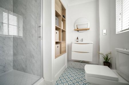 Completely refurbished with new fittings and flooring comprising low flush w.c., shower, wash hand basin with storage underneath and further storage cabinet. Radiator. UPVC double glazed window.