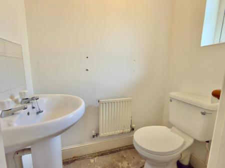 Low level W.C., wash hand basin with tiled splashback, radiator, opaque UPVC double glazed window to front.