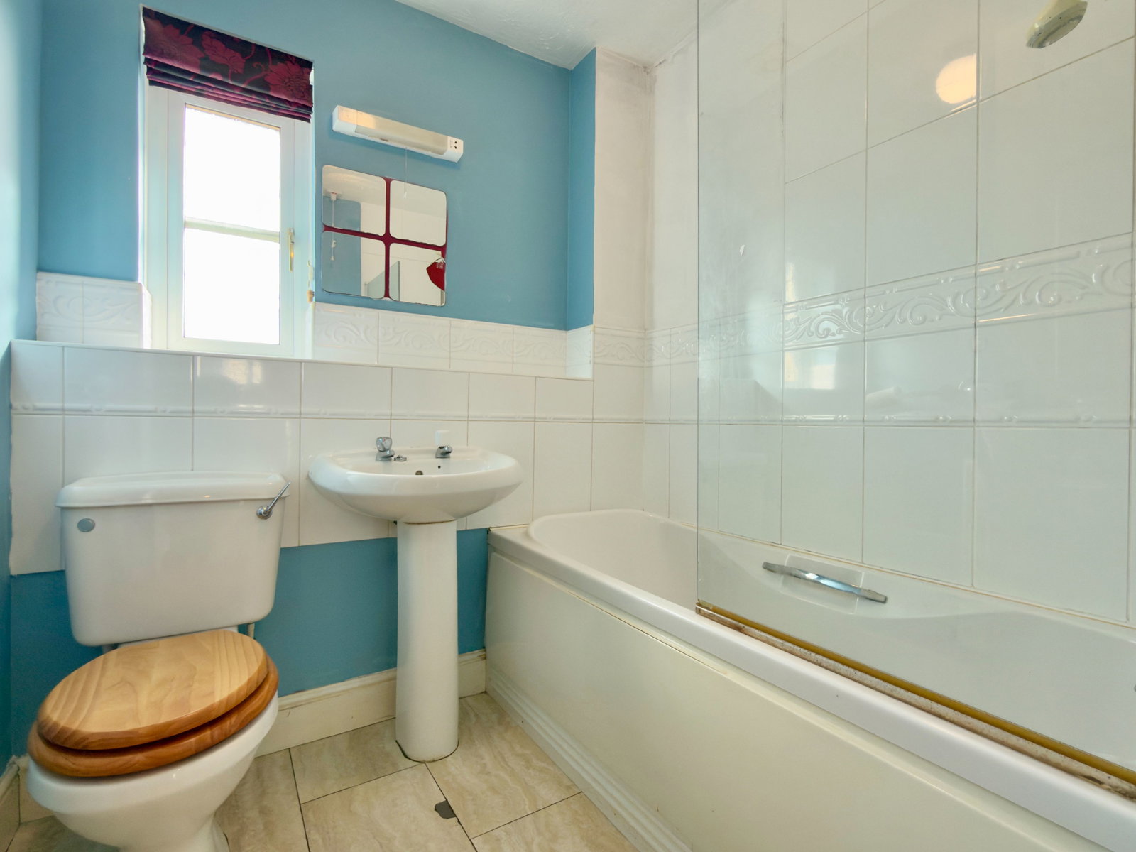 Part tiled suite comprising panelled bath with electric shower over, low level W.C., wash hand basin, radiator, opaque UPVC double glazed window to rear.