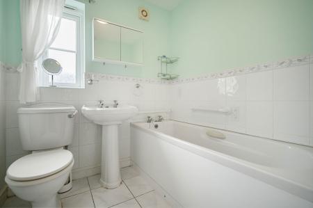 Comprising panelled bath with shower over and tiled surrounds, low level W.C., wash hand basin, tiled splashback, radiator, UPVC double glazed opaque window to side.